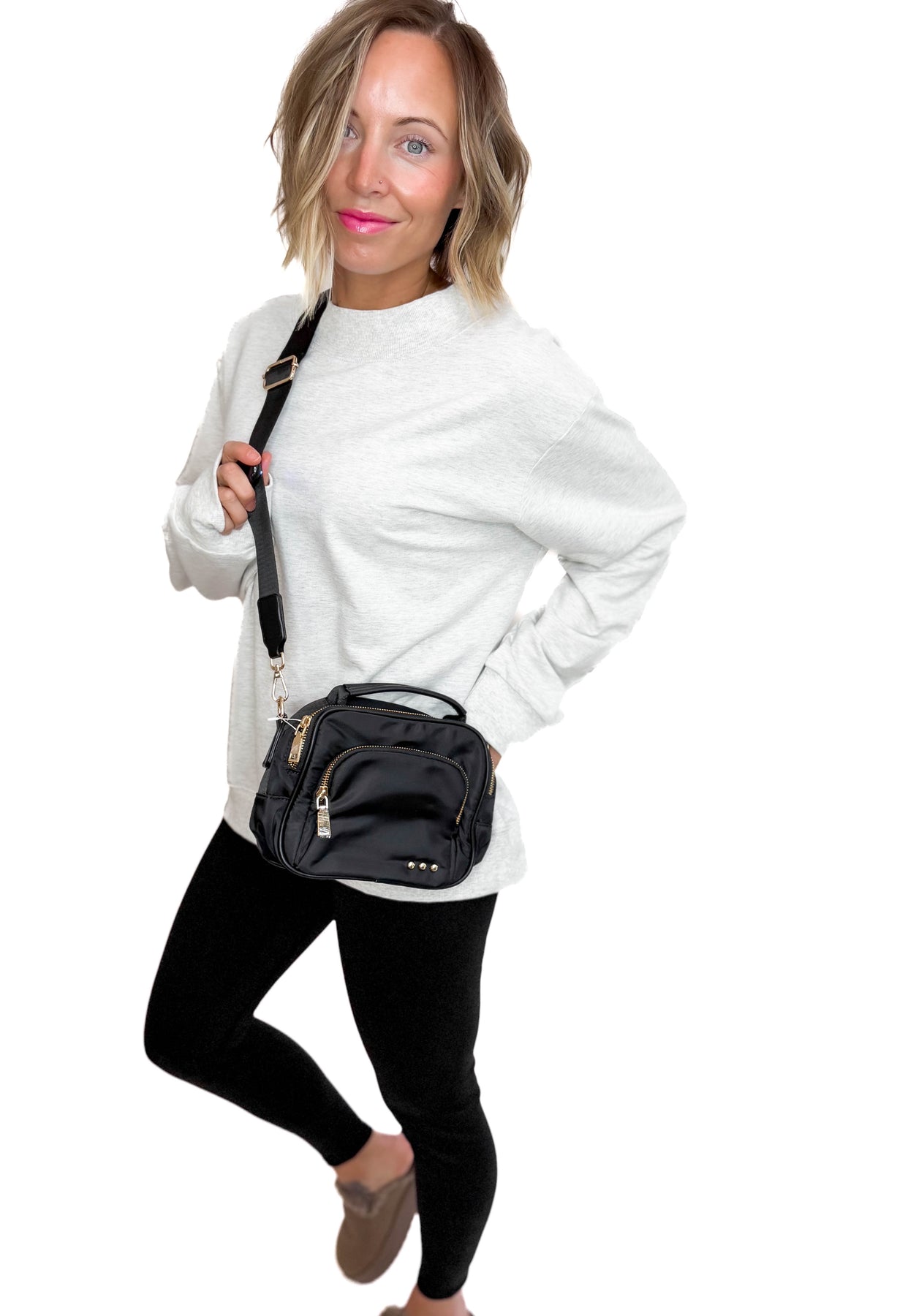 Additional: Two exterior zipper openings (main + small front), interior zipper pocket, key holder, back button pocket, hand holder straps