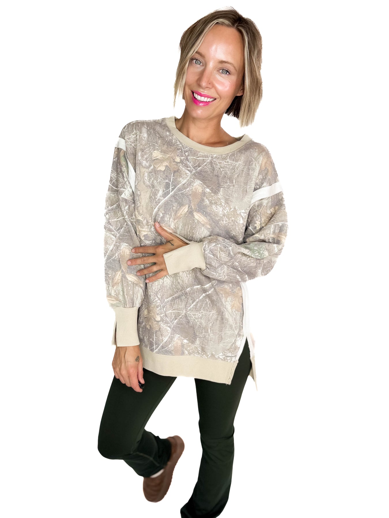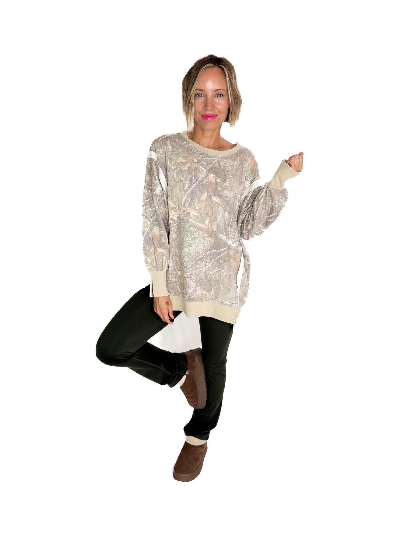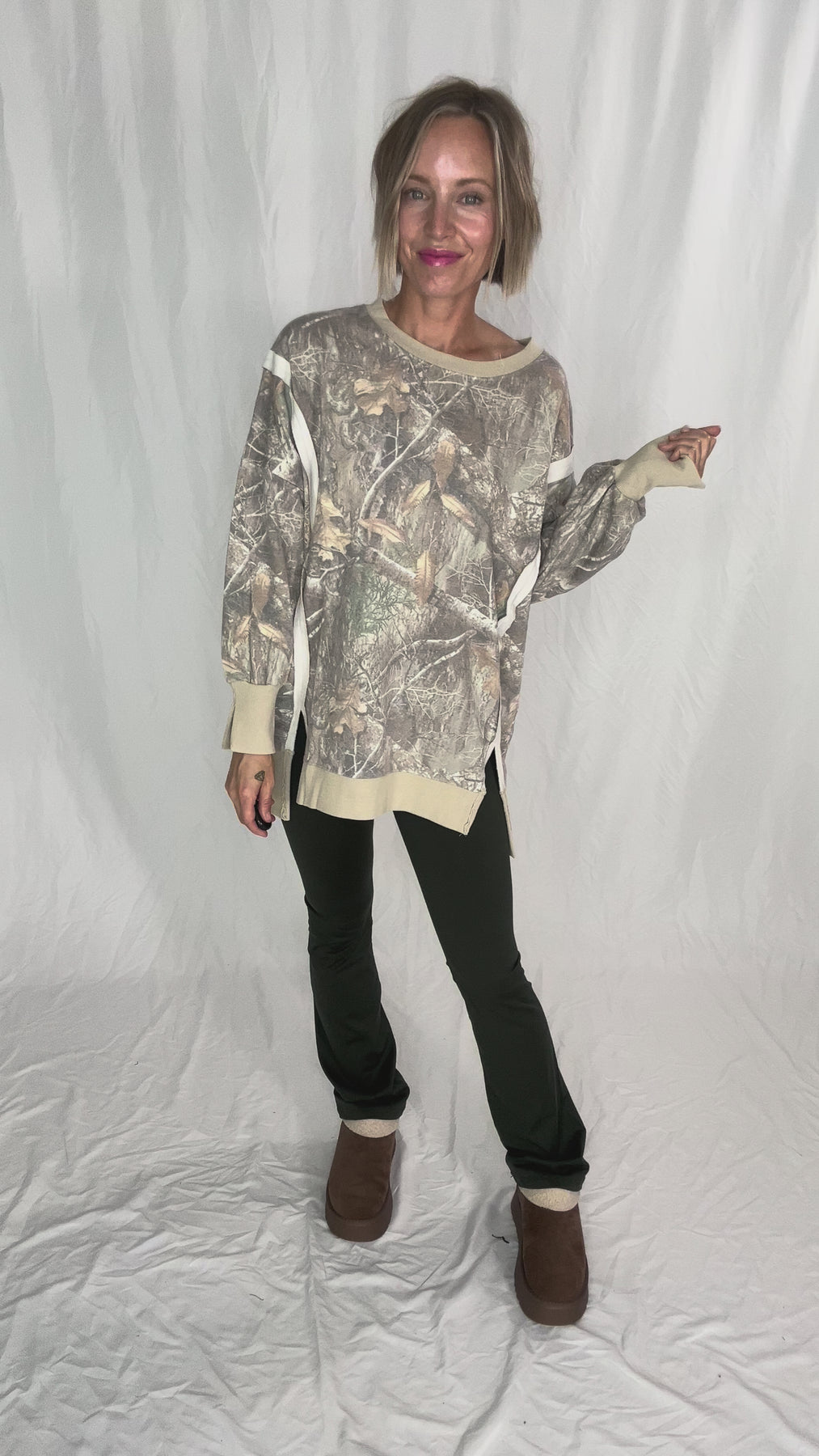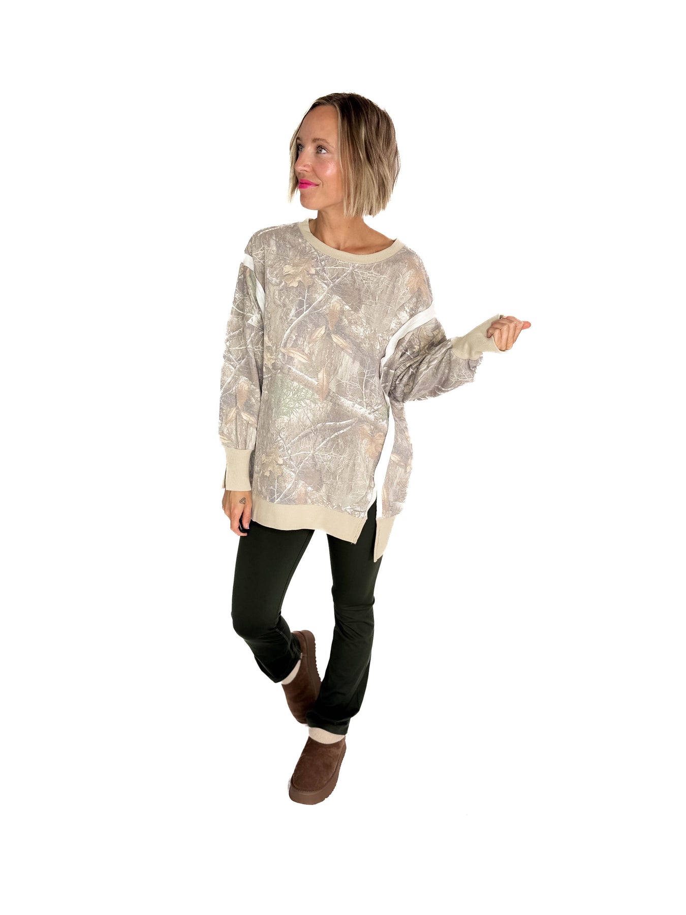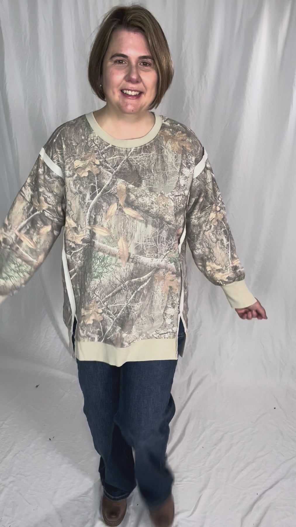 Additional: Forest Camo, Inverted Seam Details, Ribbed Cuffs and Hem, Slits at Cuff and Hem, High-Low, Soft Interior