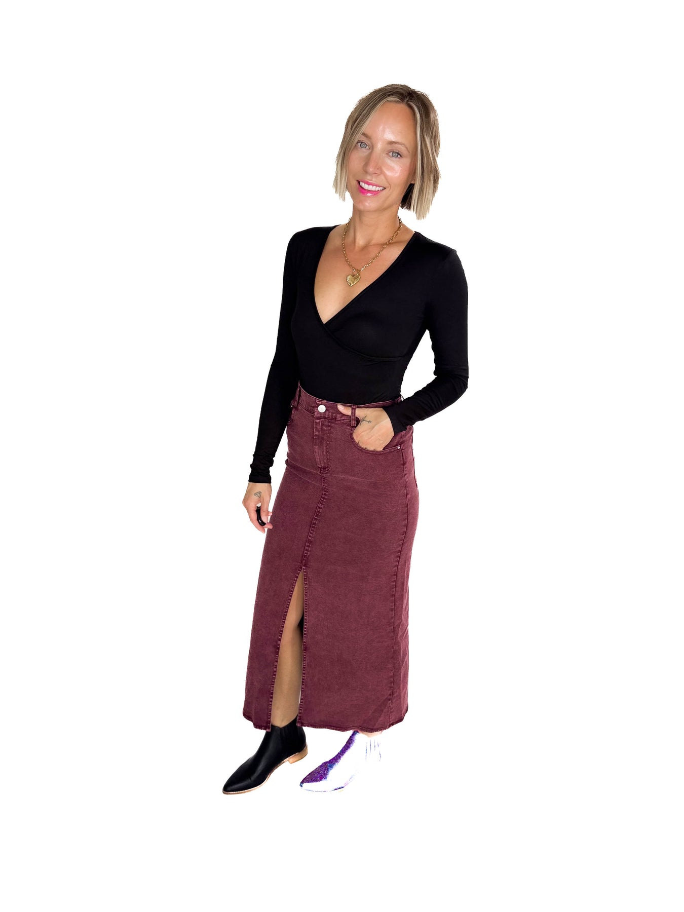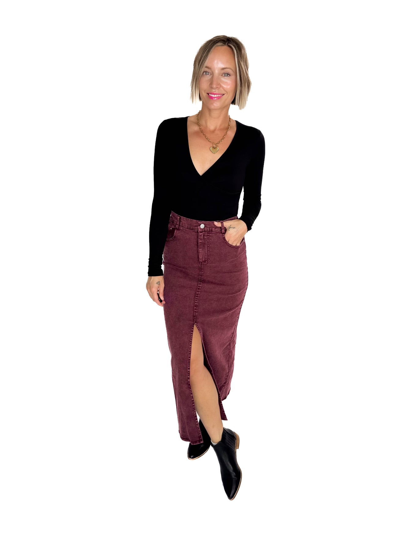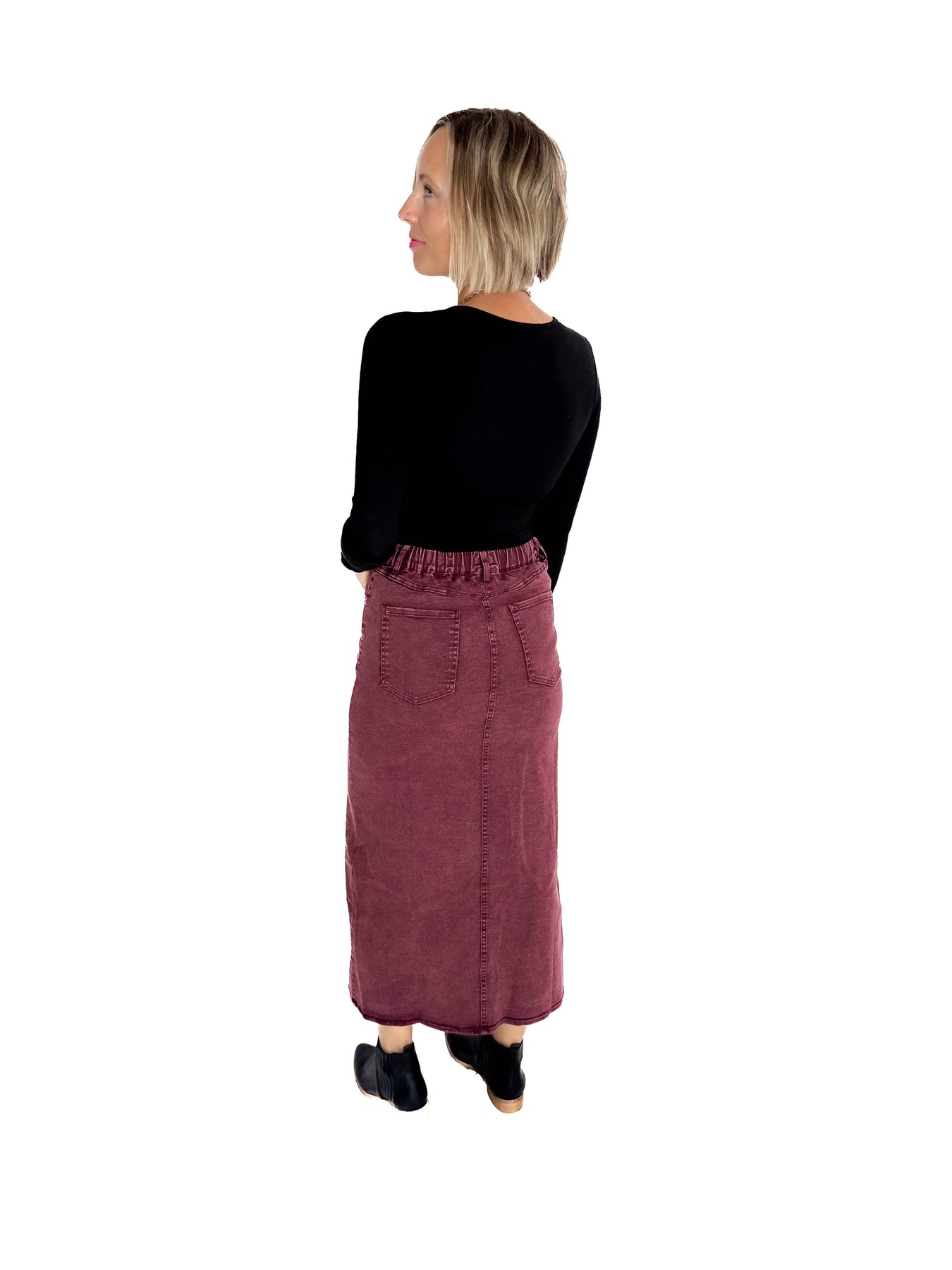 Additional: Twill Maxi Skirt, Elastic Waist, Button and Fly, Front Slit, Mineral Wash, Not Stiff.