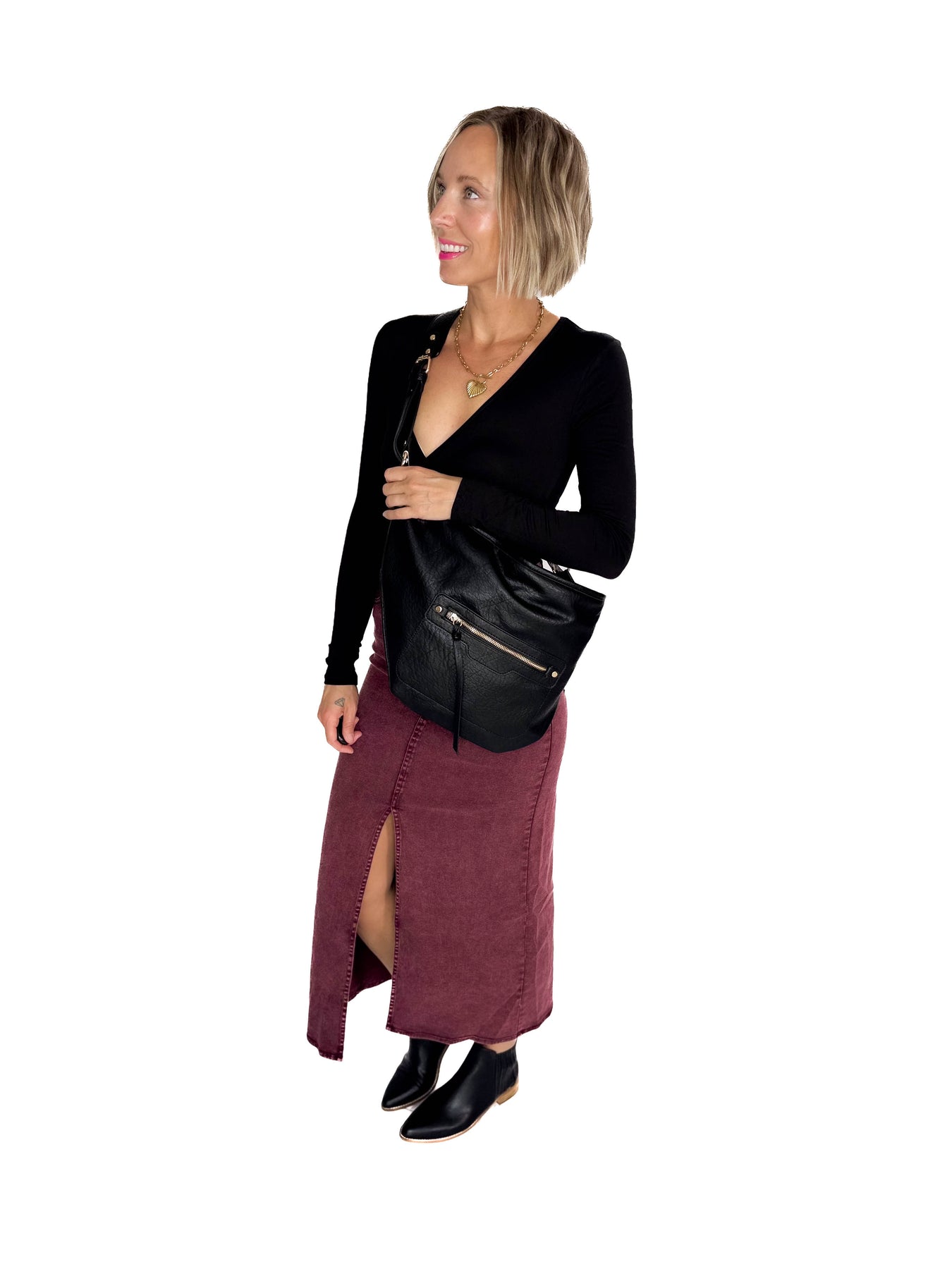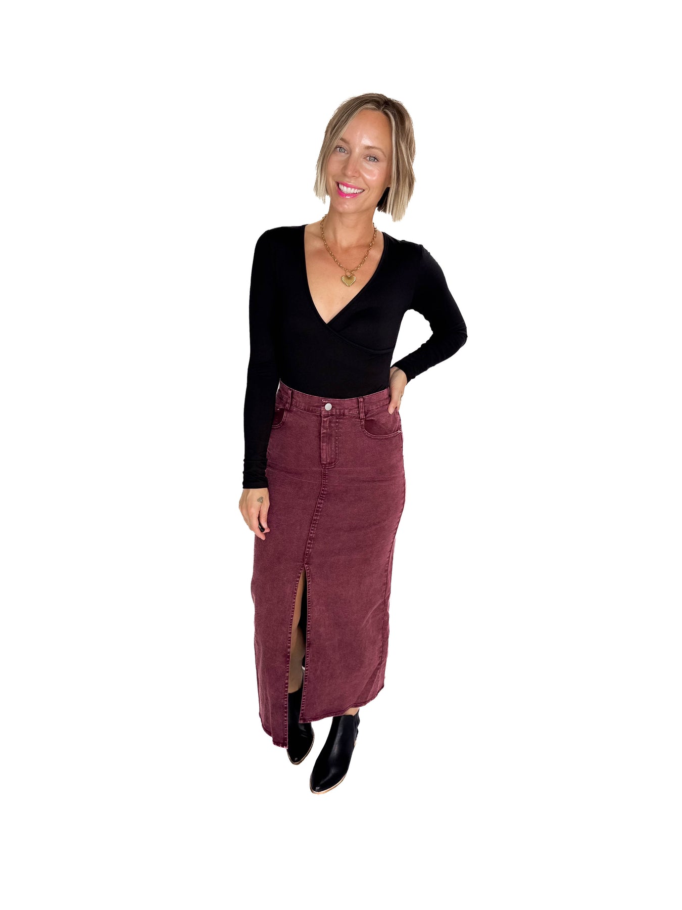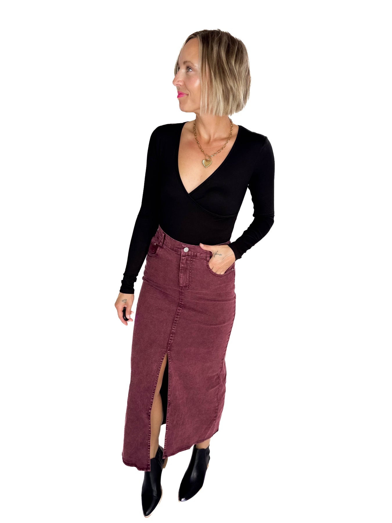 Additional: Twill Maxi Skirt, Elastic Waist, Button and Fly, Front Slit, Mineral Wash, Not Stiff.