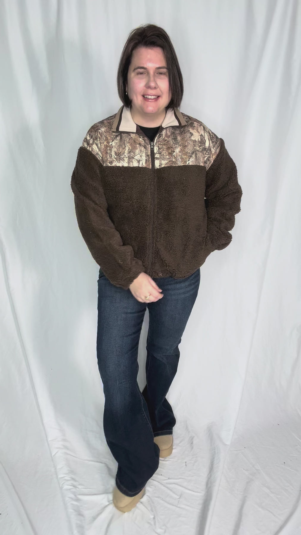 Additional: Cozy Sherpa, Floral Quilted Camo Contrast, Full Front Zip, Elastic Cuffs, Cinch-Cord Base, Mock Neck