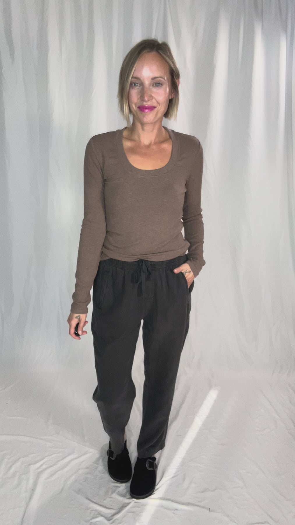 Casual meets chic — elastic waist tapered pants with a drawstring for all-day comfort and style.