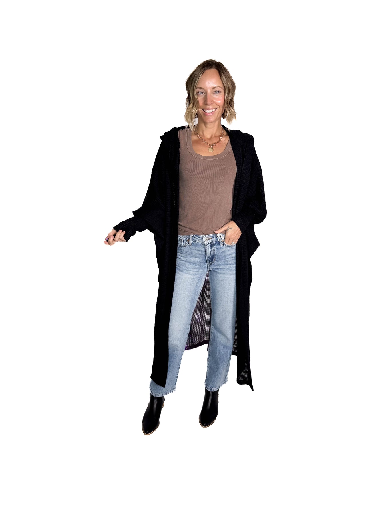 Additional: Hooded, Waffle Knit Texture, Longline Duster Style, Adjustable Drawstrings