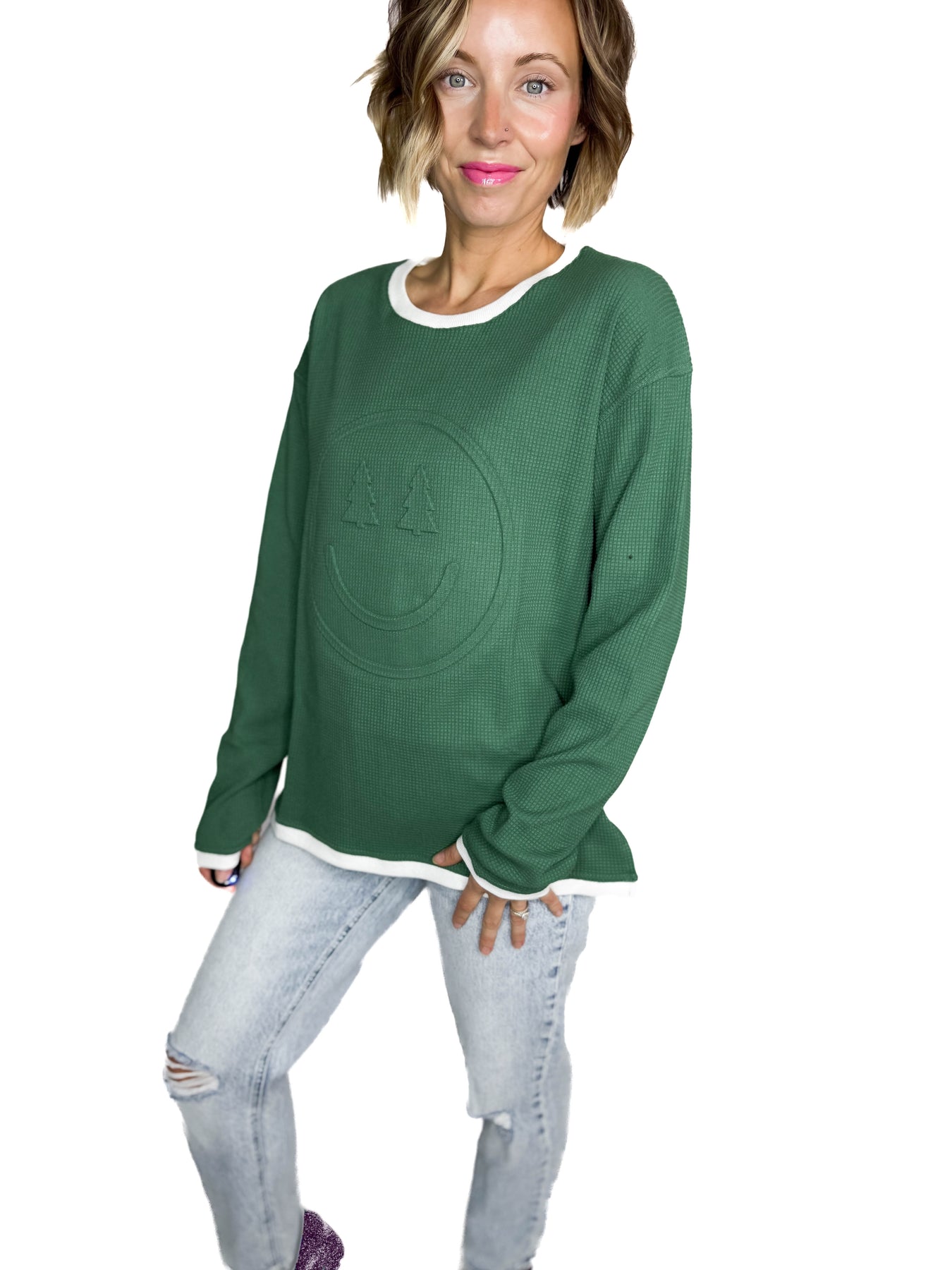 Additional: Waffle Knit, Smiley Face Christmas Puffer Graphic, Tree-Shaped Eyes, Side Slits