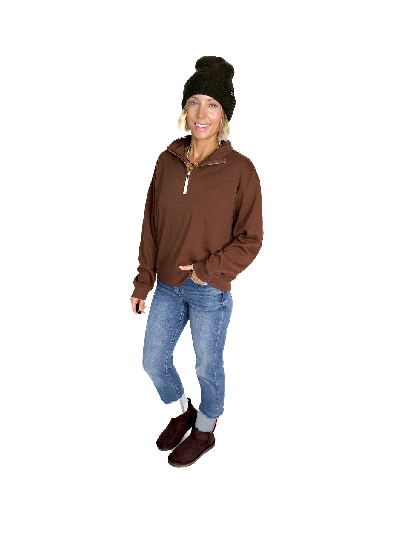 Additional: ¼ Zip, Luxe Gold Hardware, Ribbed Cuffs and Hemline, Soft Interior