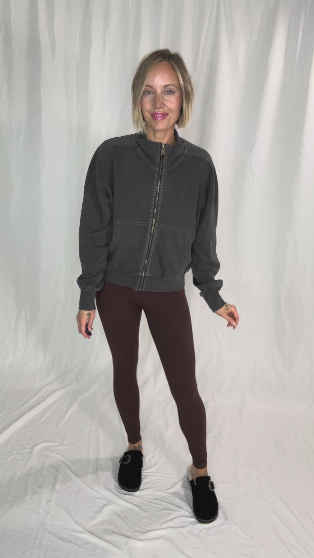 Adeline Cozy Acid Wash High Collar Full Zip- WASHED CHARCOAL