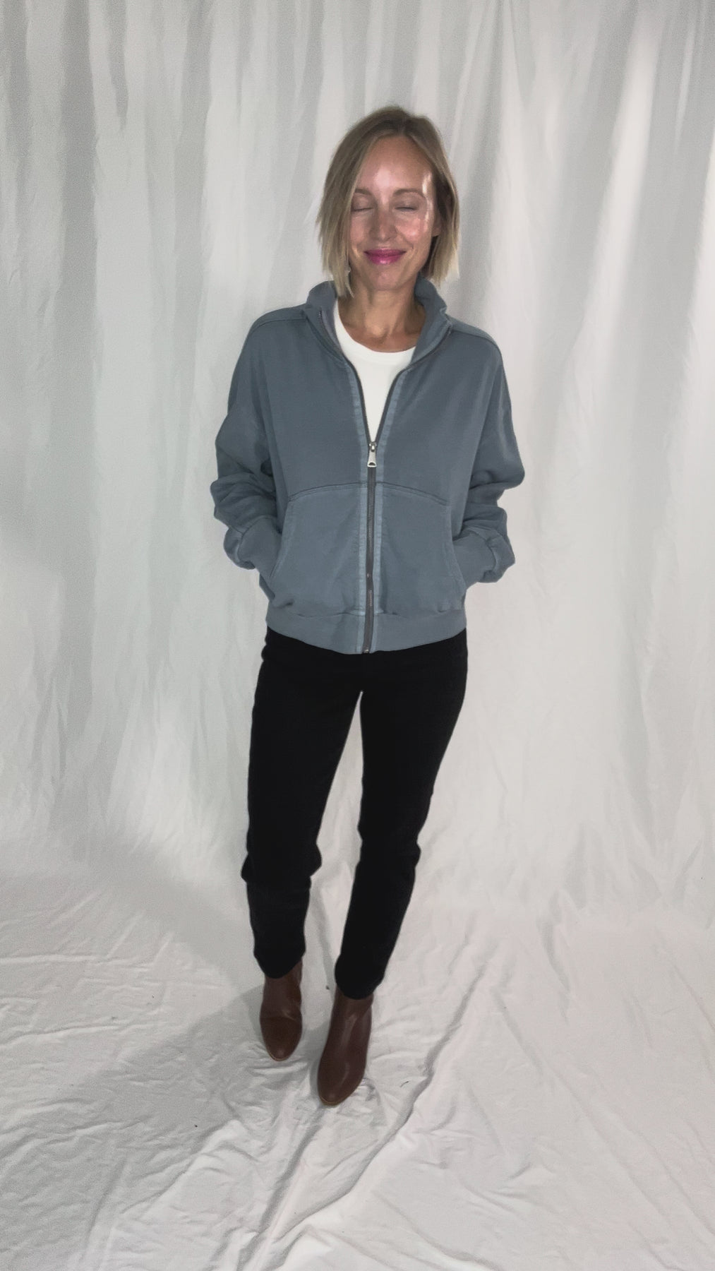 Adeline Cozy Acid Wash High Collar Full Zip- WASHED TEAL
