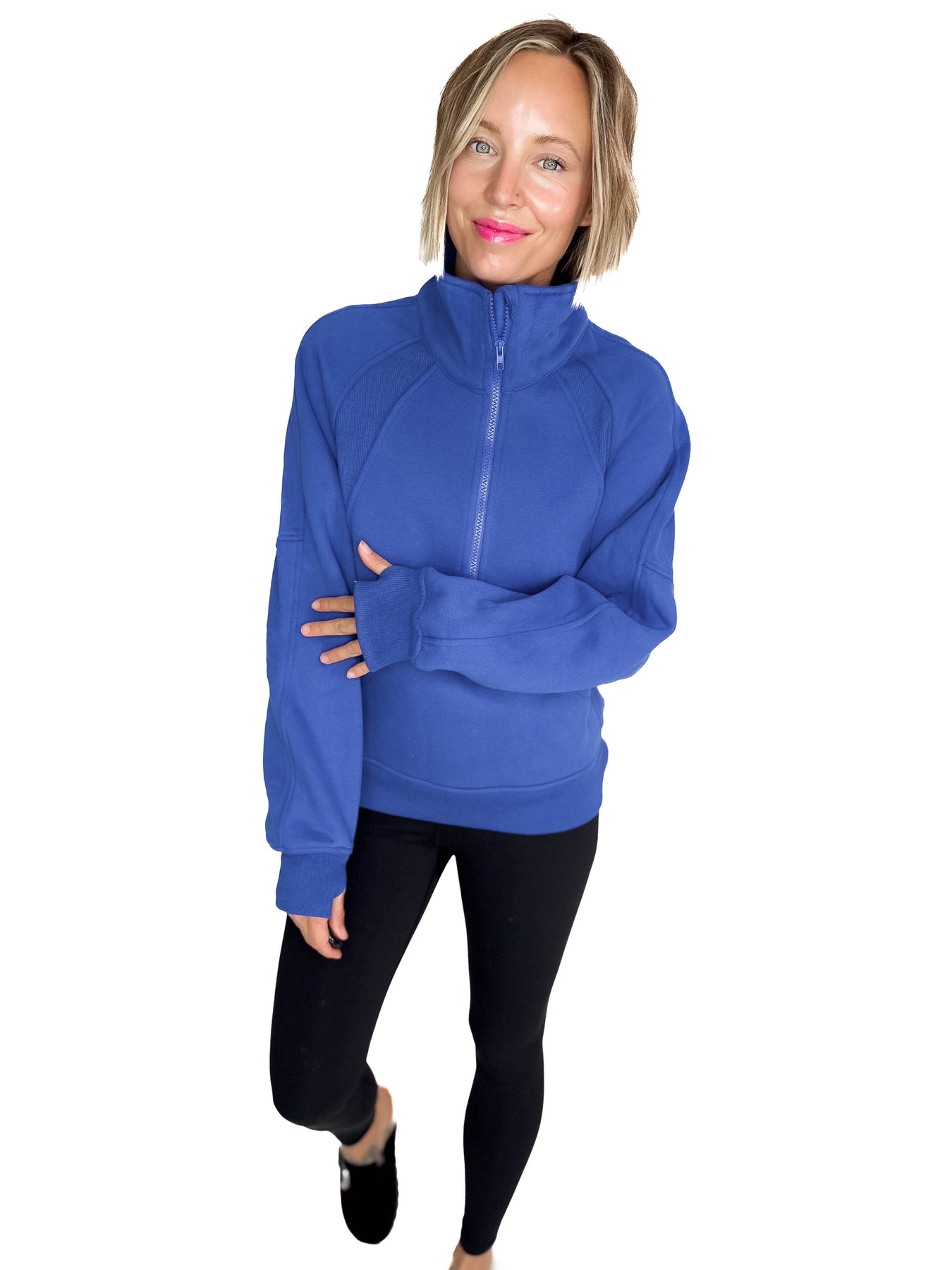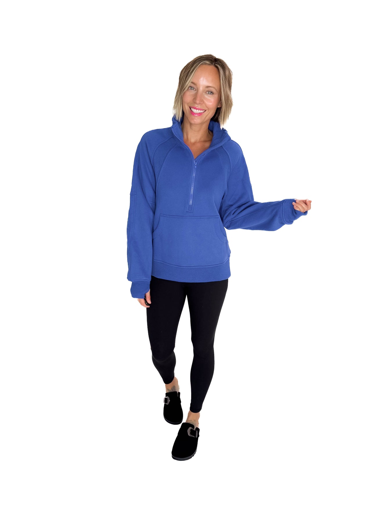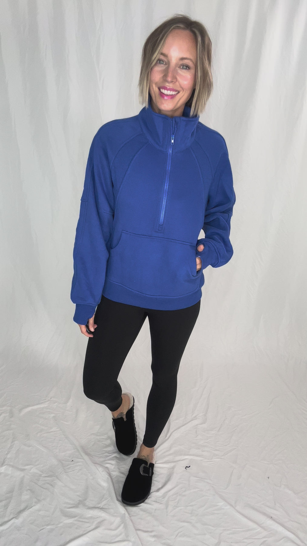 Additional: 1/2 Zip Mock Neck, Ribbed Contrast, Thumb Holes, Kangaroo Pocket, Fleecy Interior.