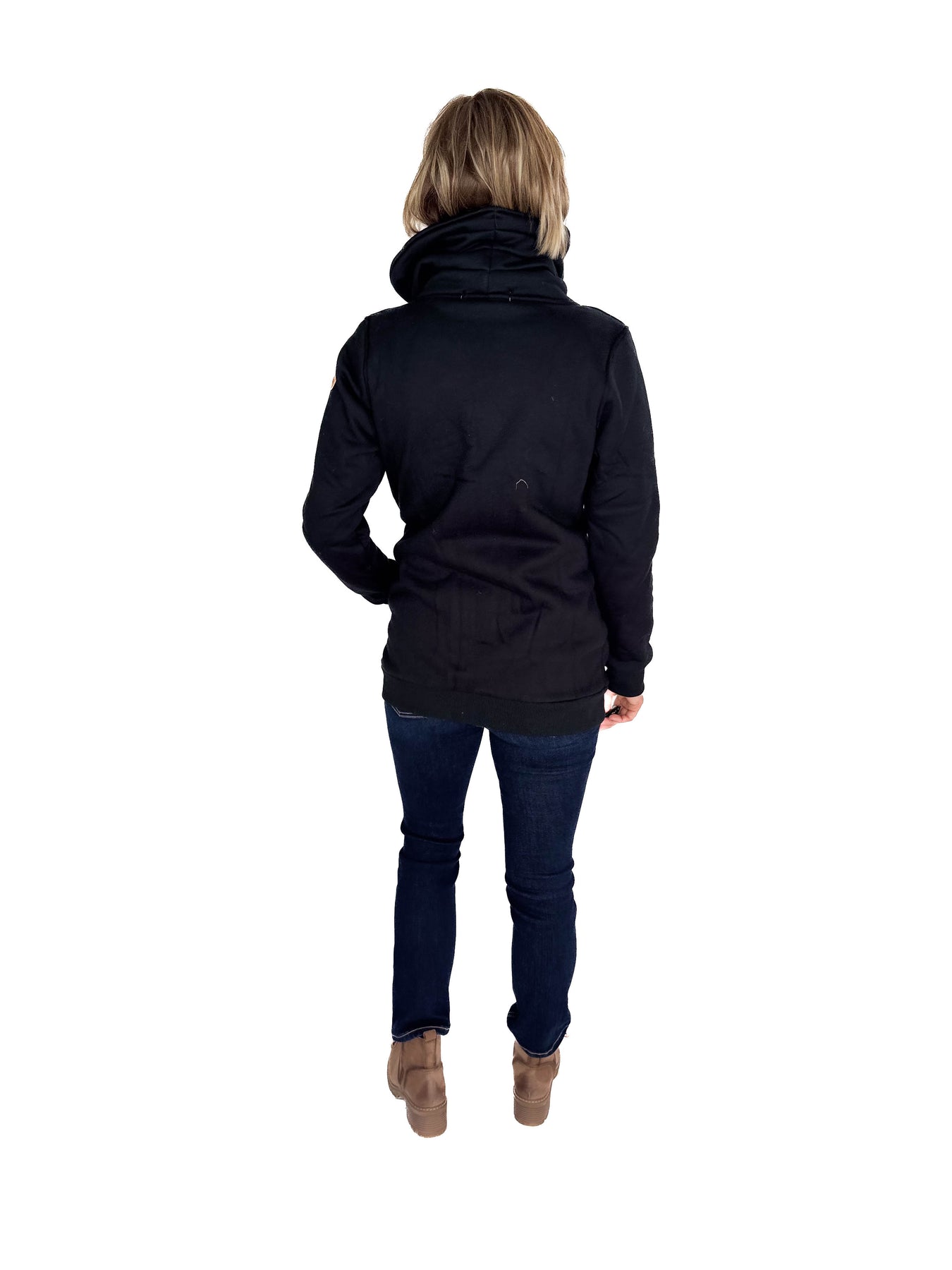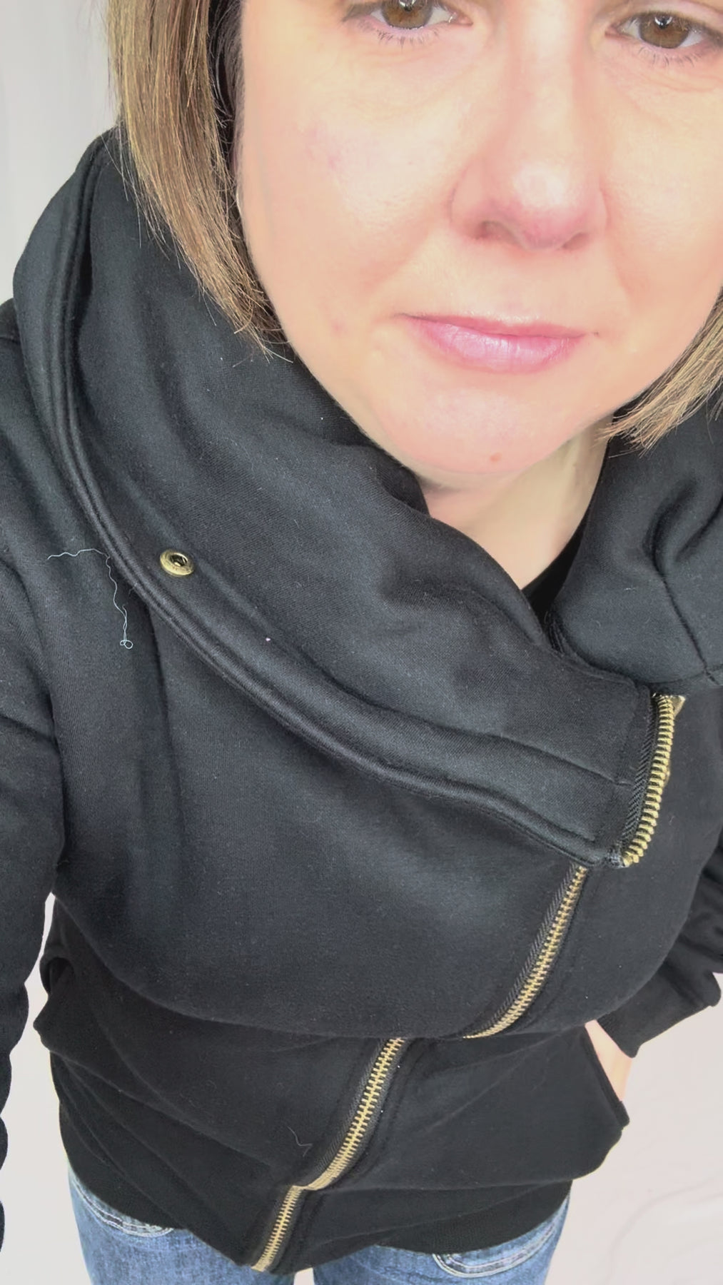 Cowl neck, asymmetrical zip, and pockets — all the details that make this hoodie stand out!