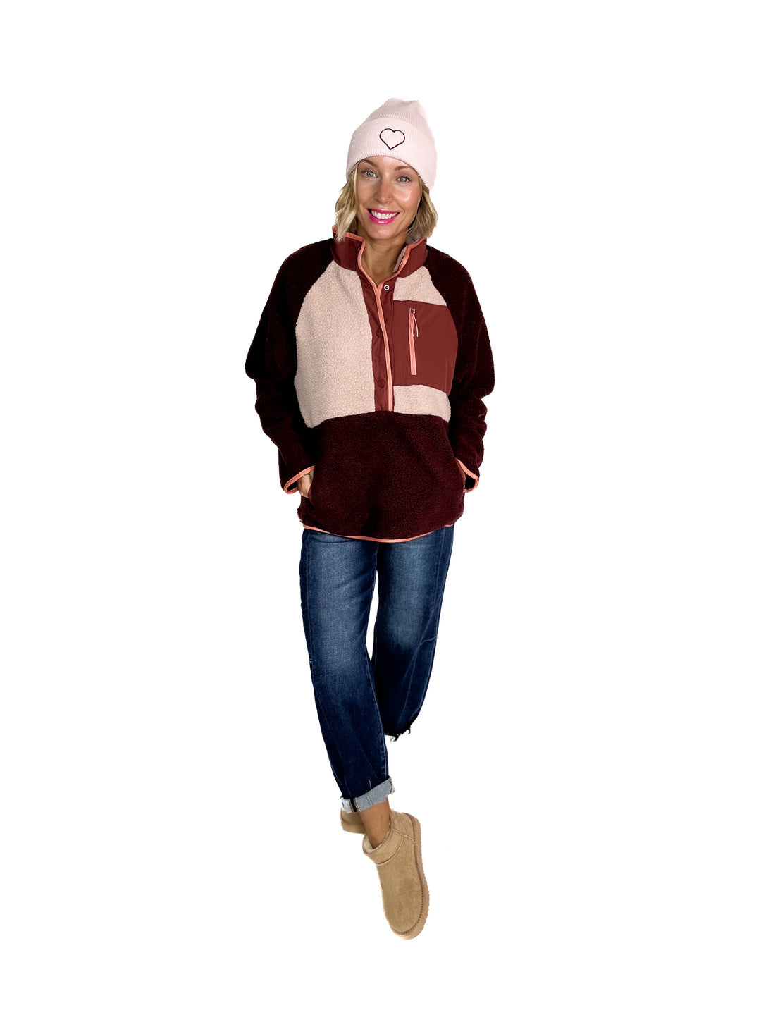 Tundra Mock Neck 1/2 Zip Sherpa Jacket- TAUPE /PEACH CREAM