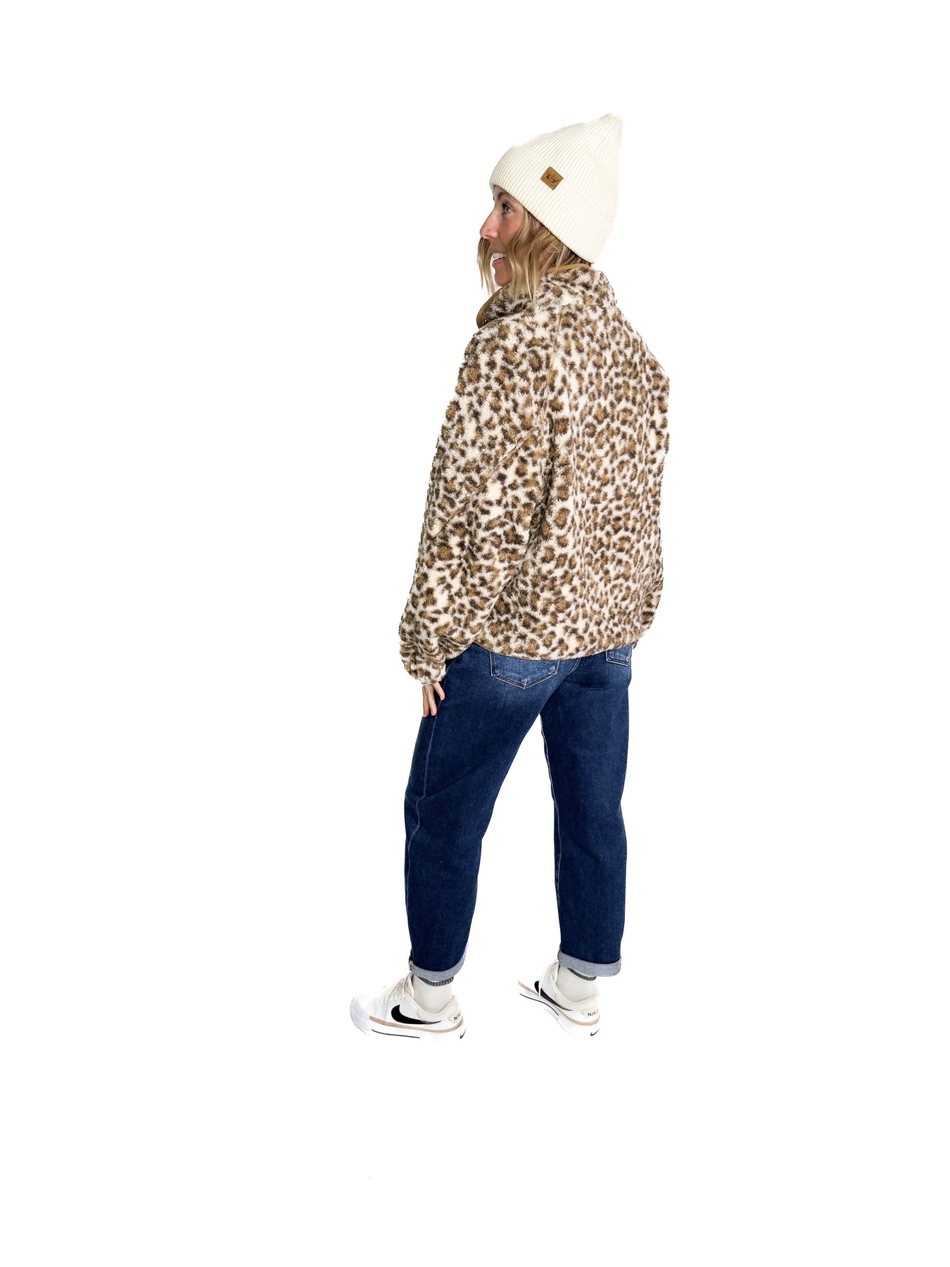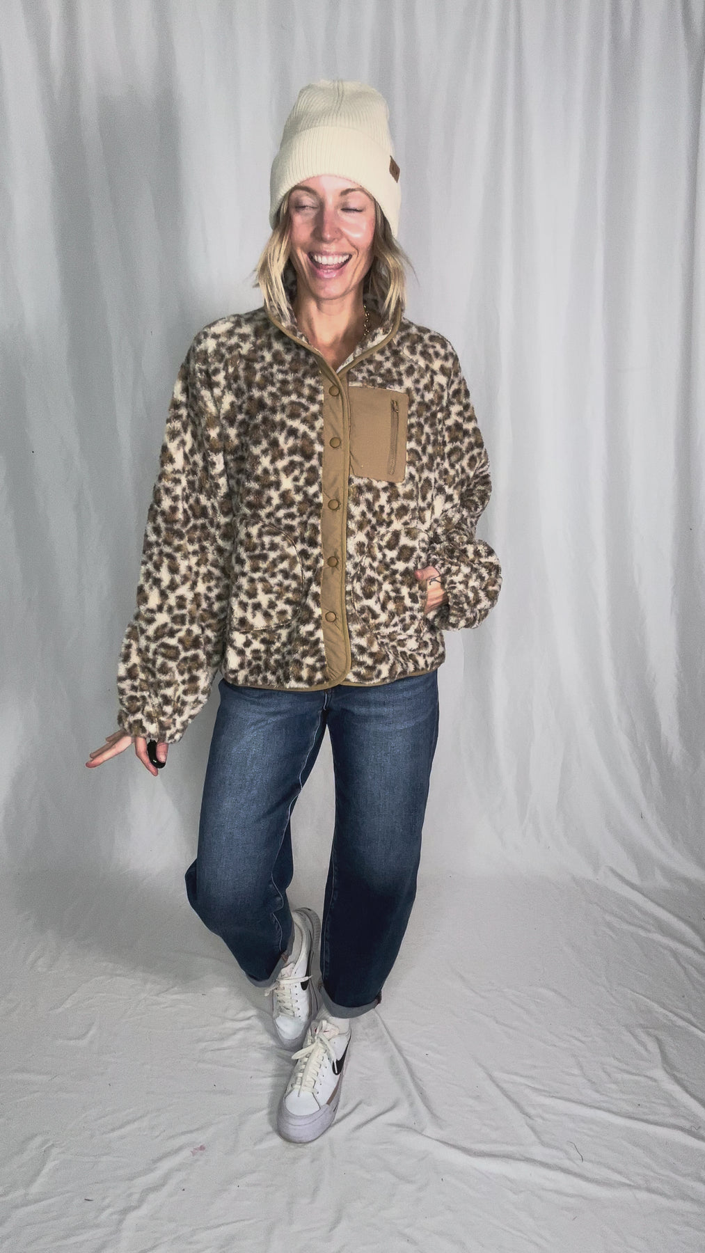 Britney Snap Button Sherpa Jacket- CREAM/LEOPARD