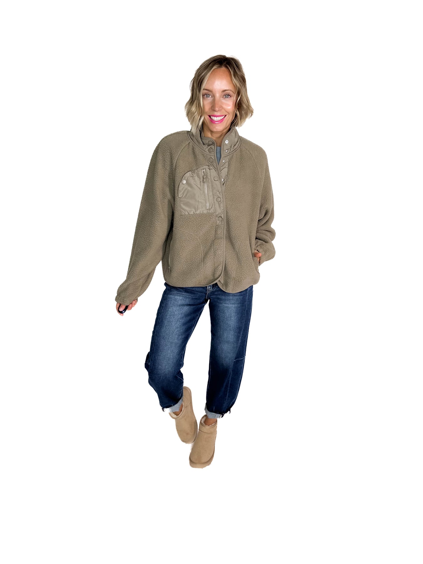 Jayde Fleece Button Up Jacket With Accent Pocket- SOFT OLIVE