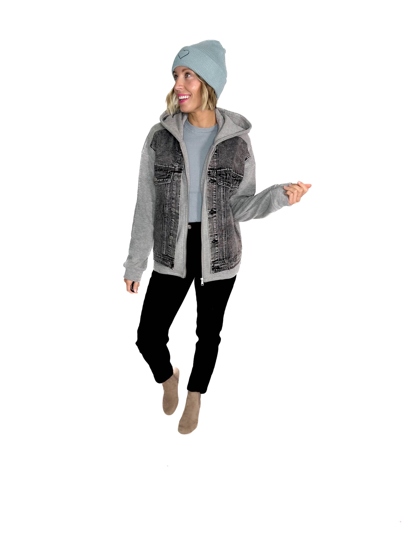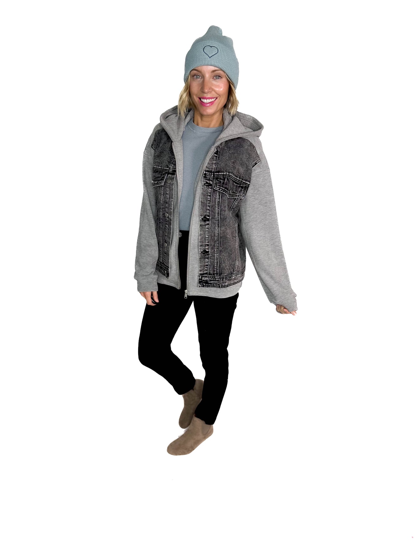 - Denim with a twist — soft hood and relaxed fit for an effortless layered look