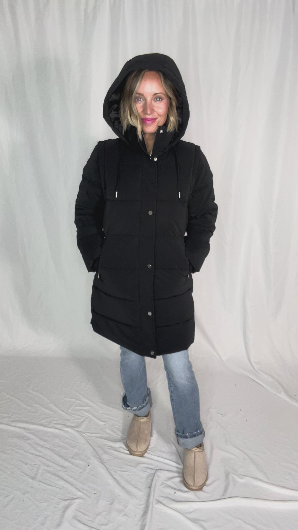 - One piece, two looks — wear it as a full-length coat or zip off the sleeves for a sleek puffer vest moment