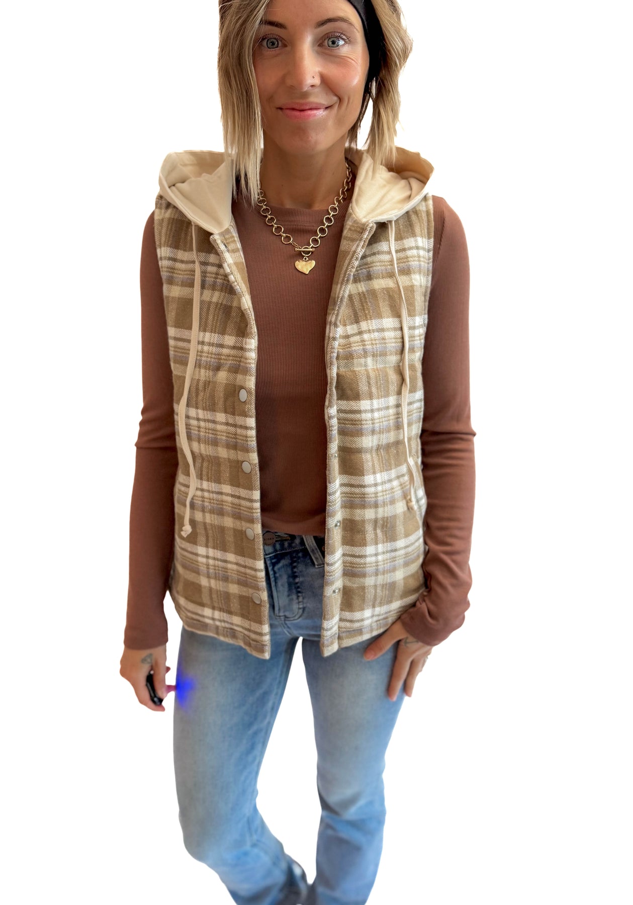 Additional: Snap closures, plaid body, hood with drawstring, functional pockets