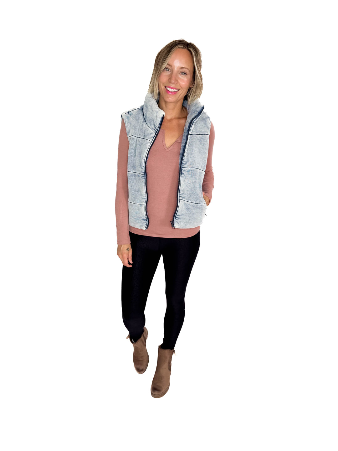 Jacklyn Denim Feel Zip Up Puffer Vest- DENIM