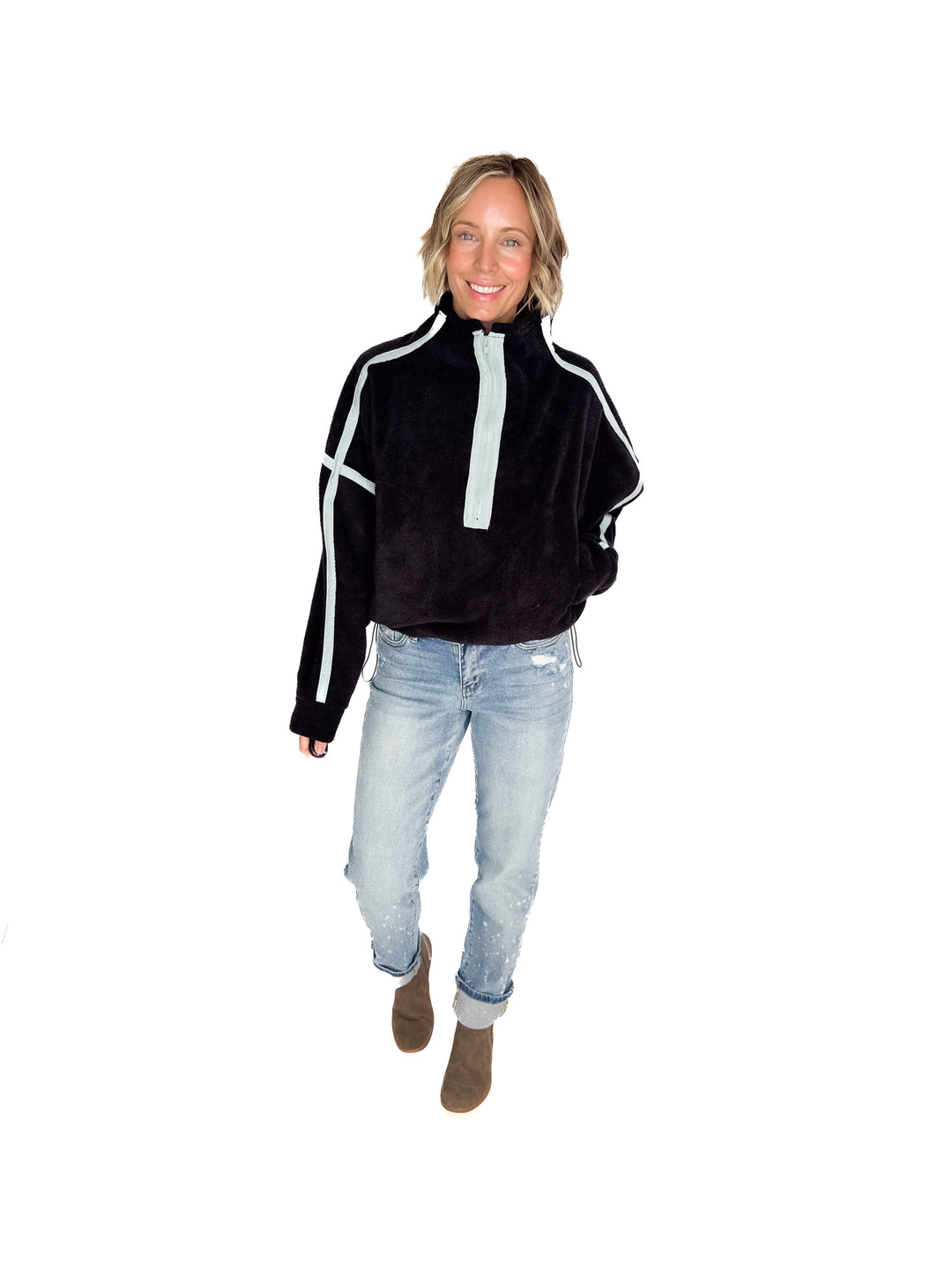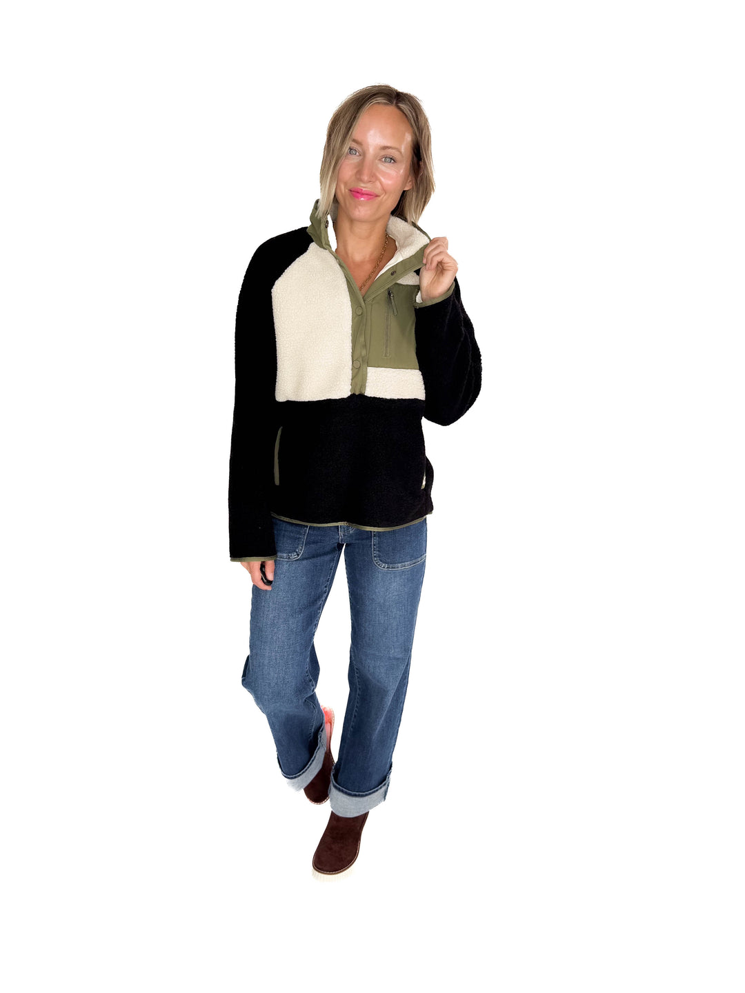Tara Quarter Snap Sherpa Pullover- BLACK OLIVE COMBO