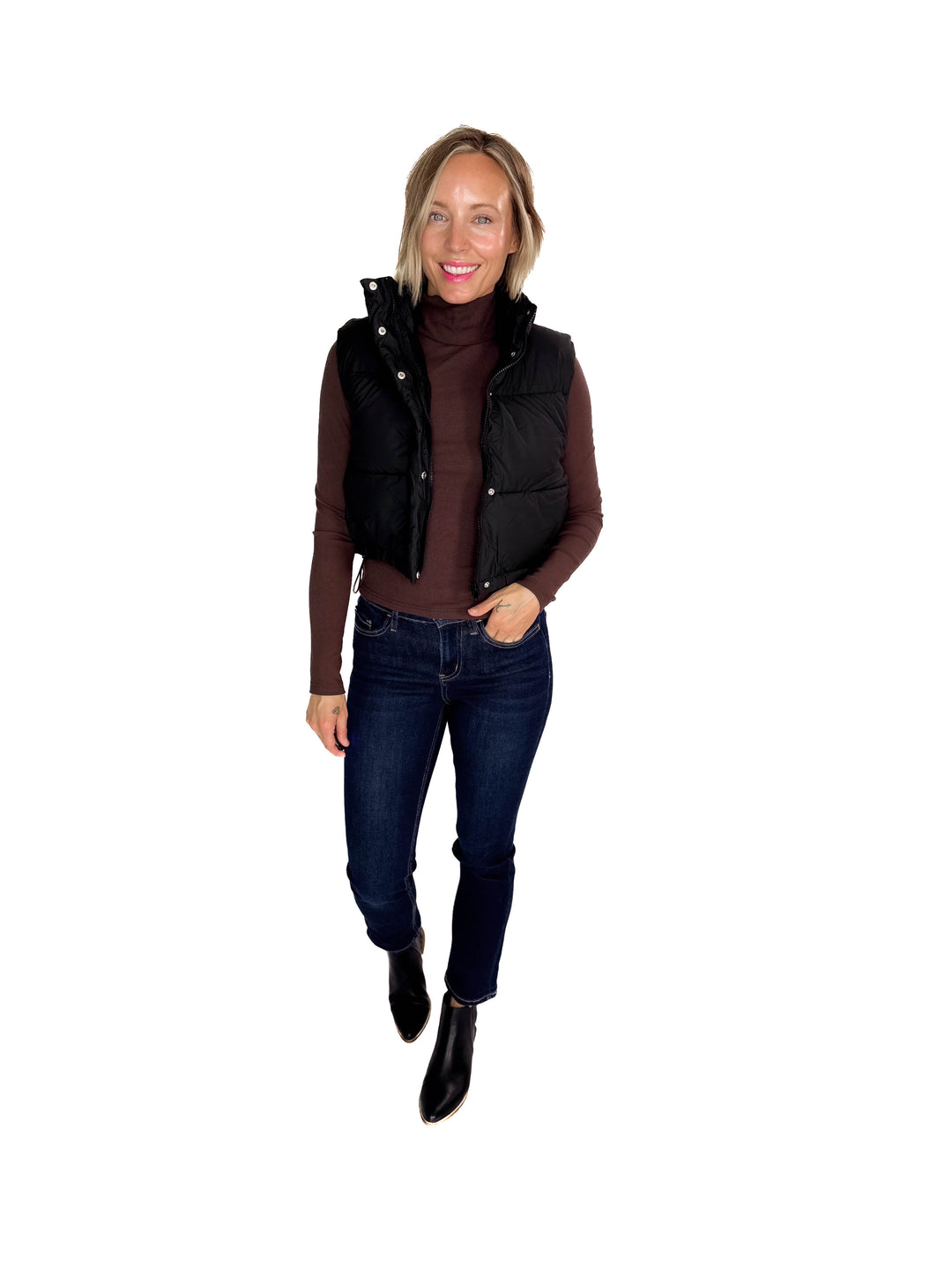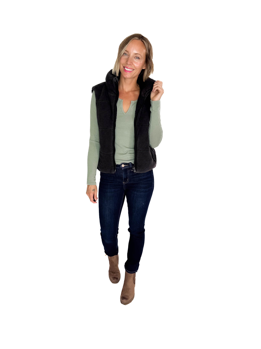 Jacklyn Denim Feel Zip Up Puffer Vest- CHARCOAL