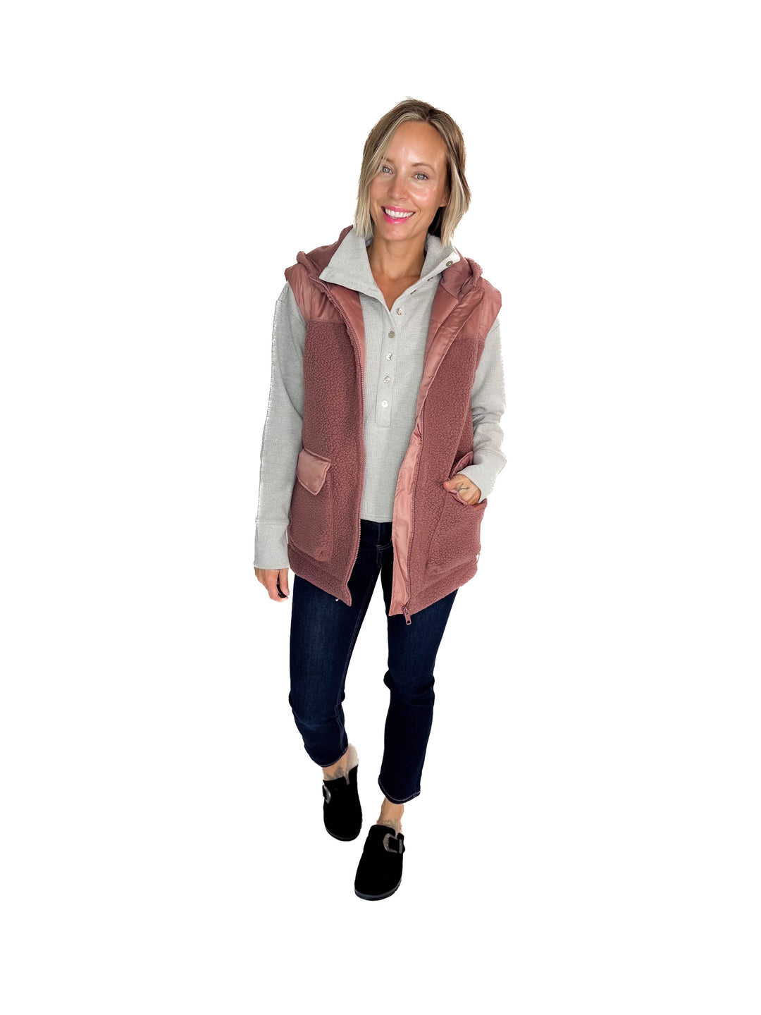 MONO B Peak Fleece Zip Up Hooded Vest- ROSE TAUPE
