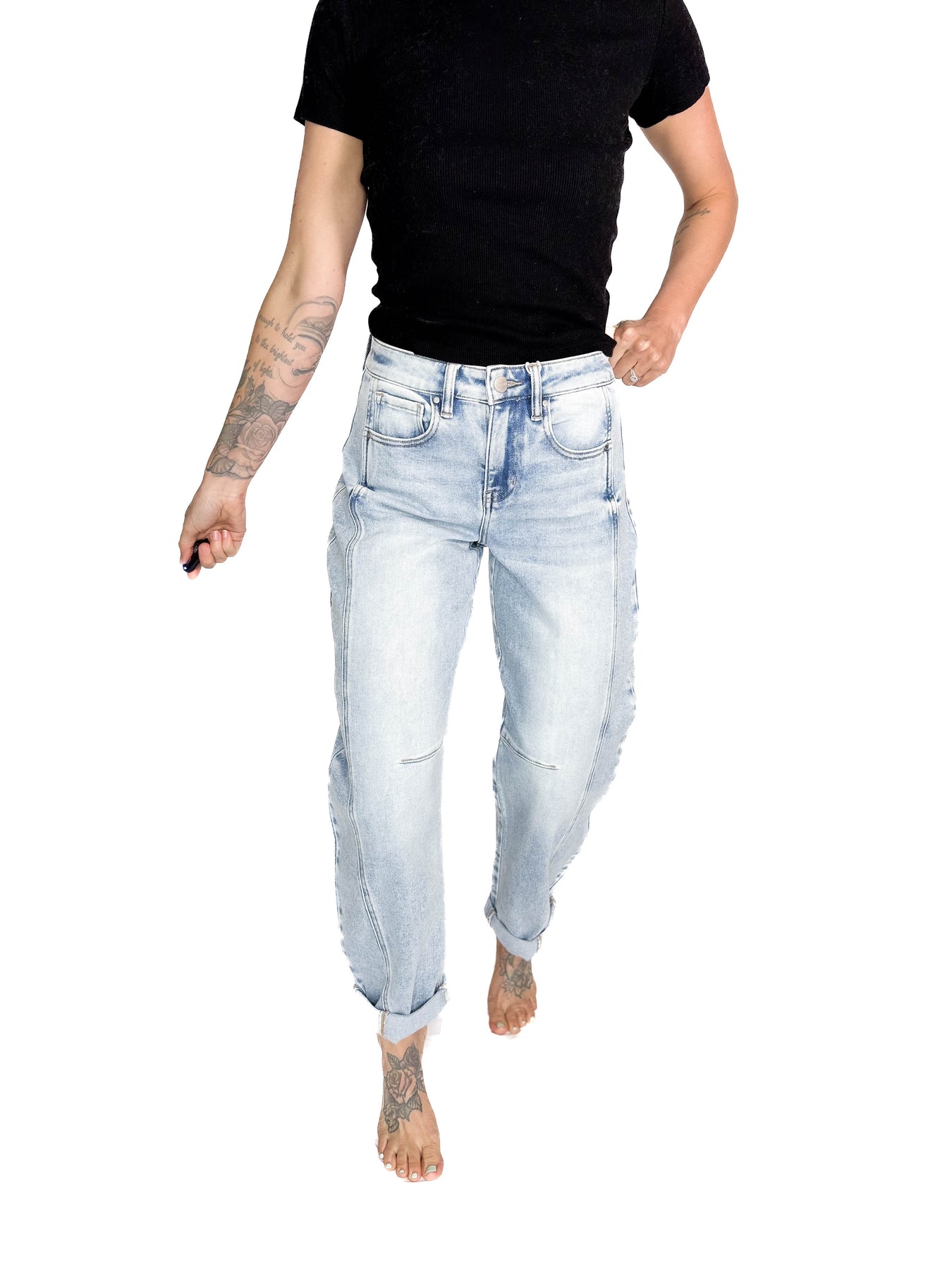 Additional: Barrel silhouette, great stretch, no distressing, cuffed or uncuffed styling