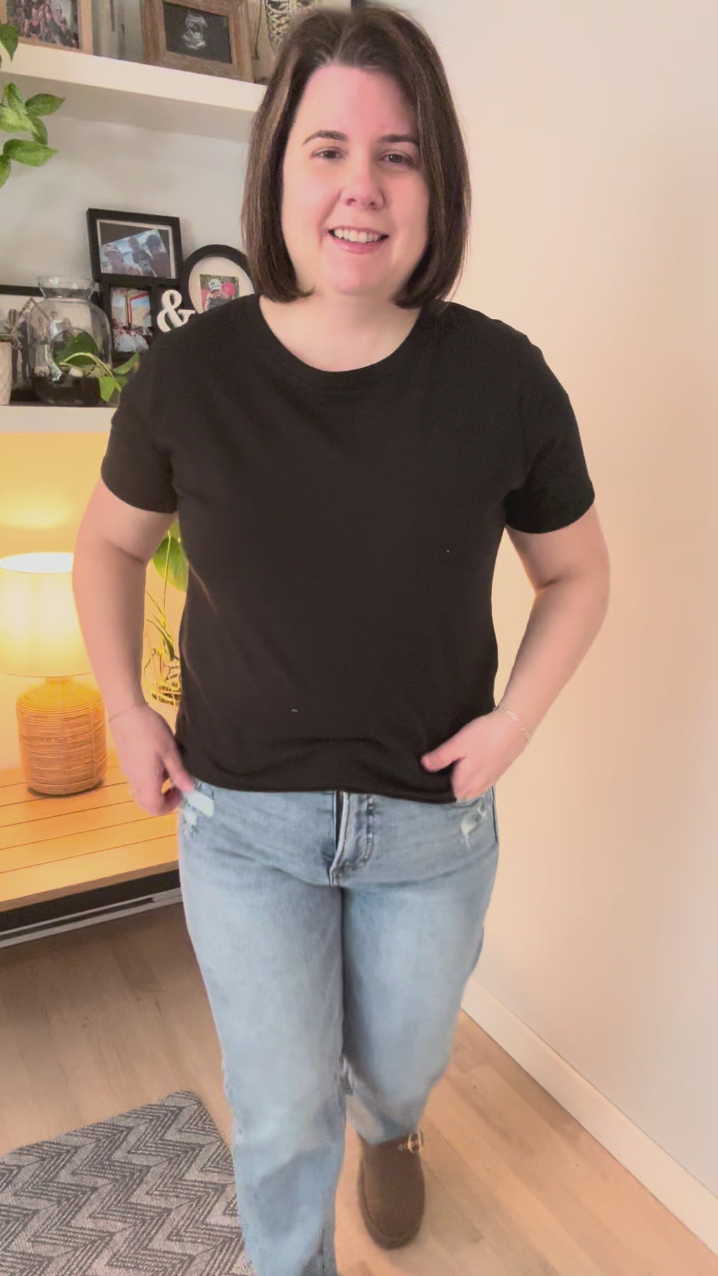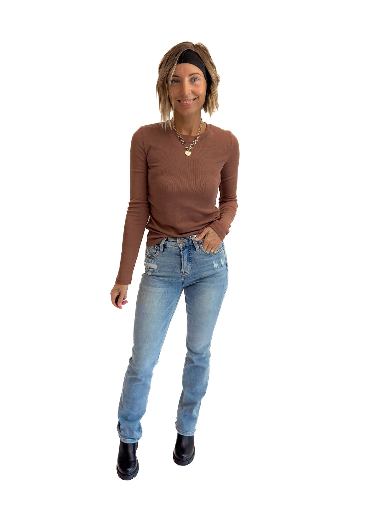 Additional: High-rise straight leg jeans, medium wash, distressed details, functional pockets and belt loops