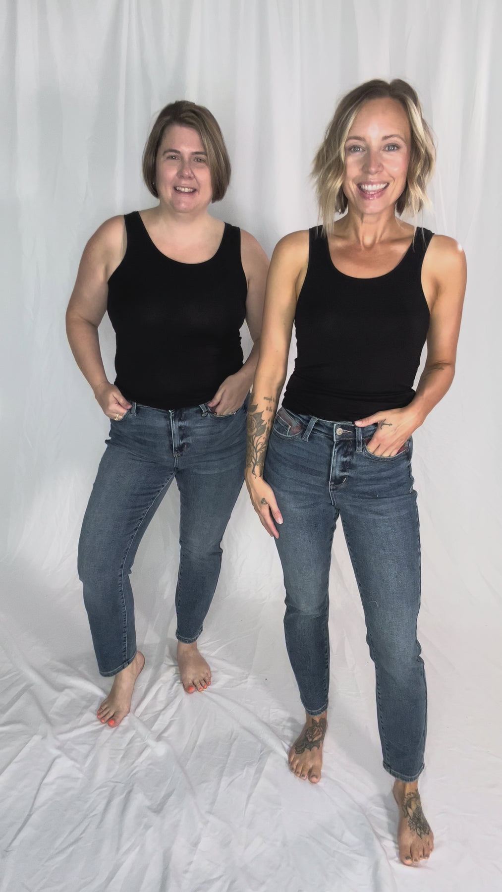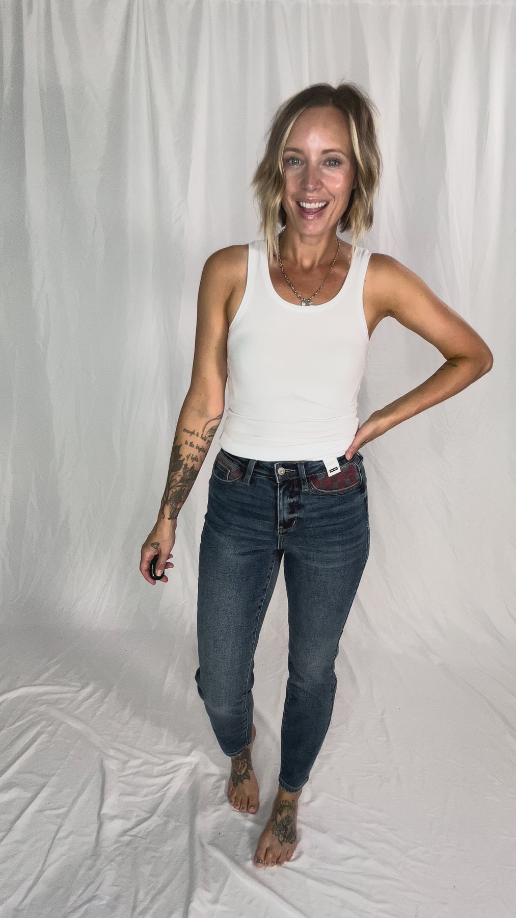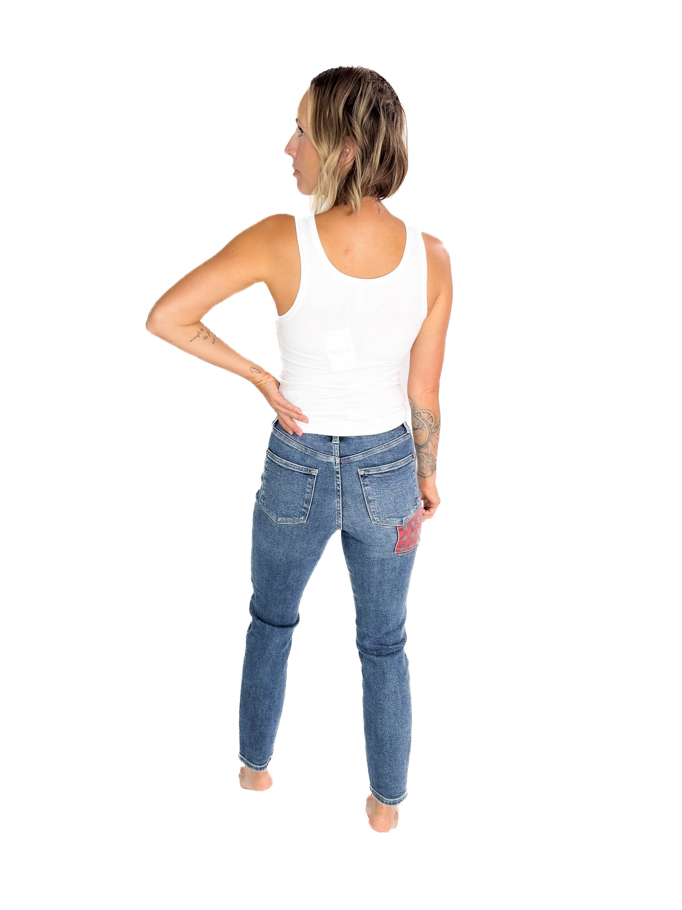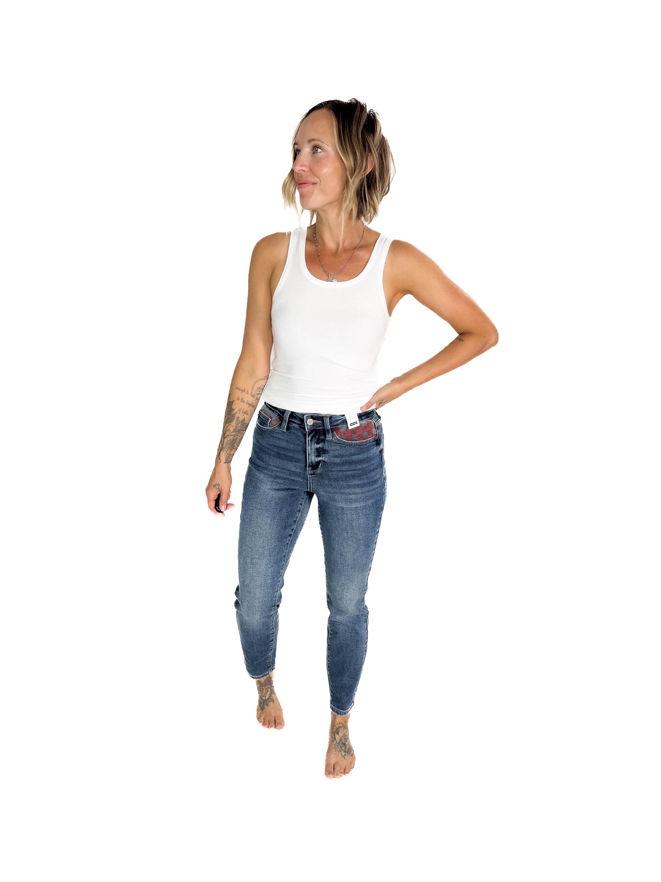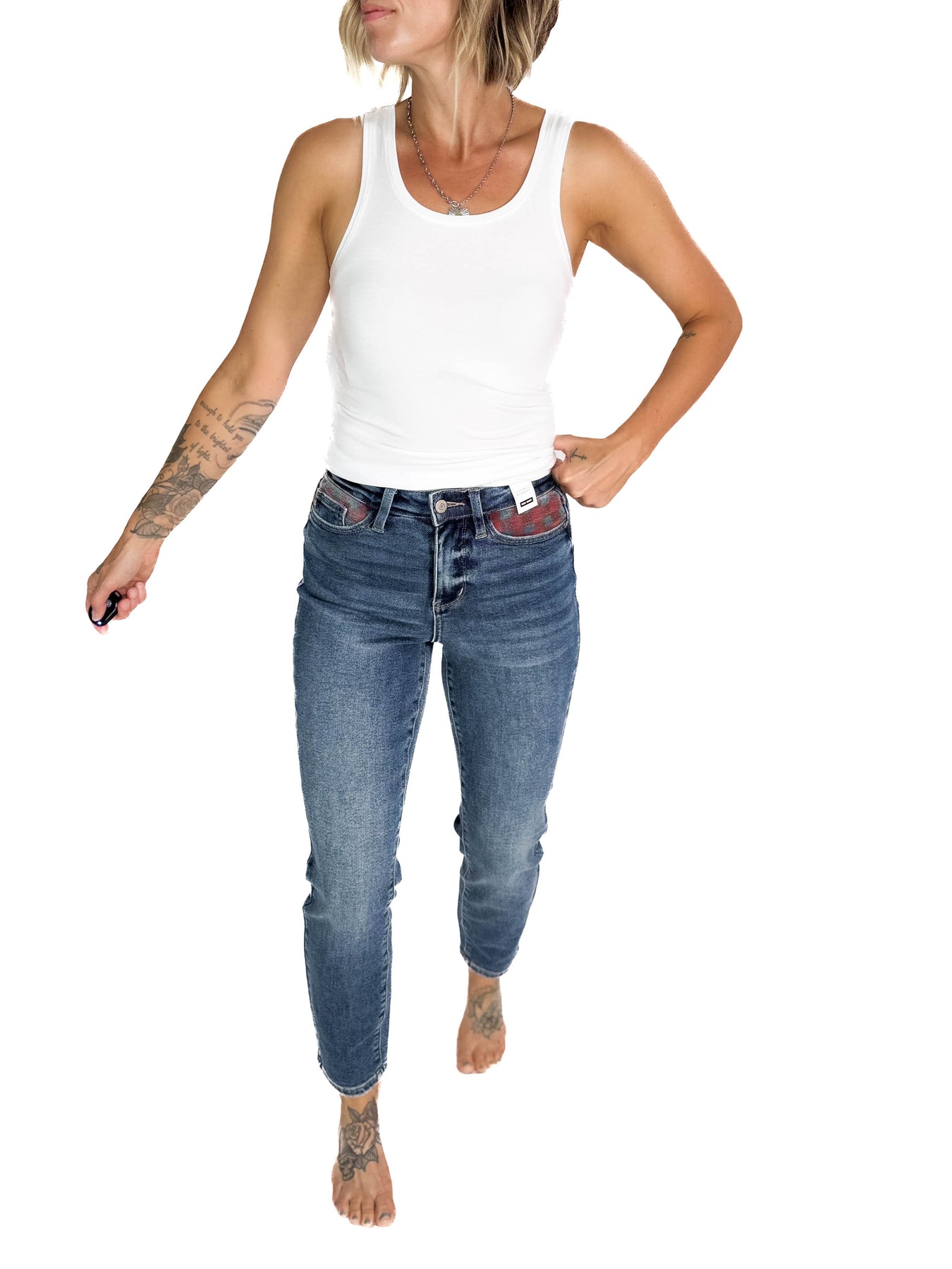 Classic dark wash with a twist—these jeans feature a subtle plaid patch detail for a pop of personality without the distress.