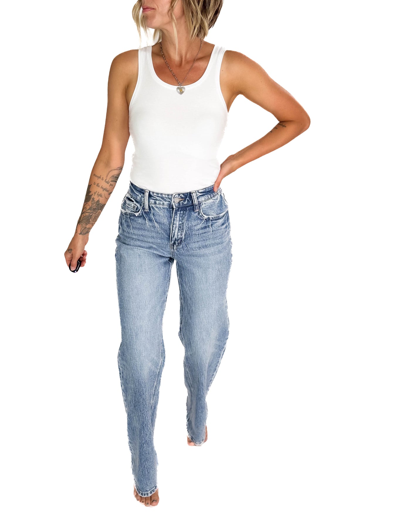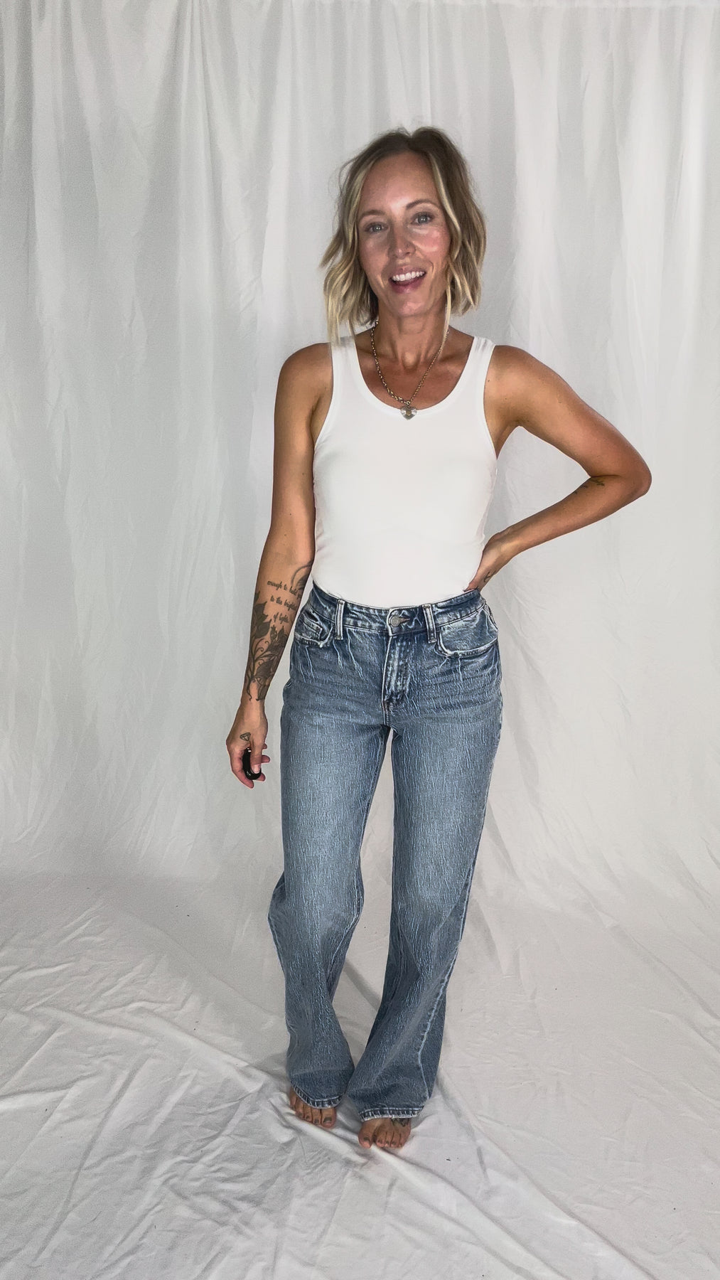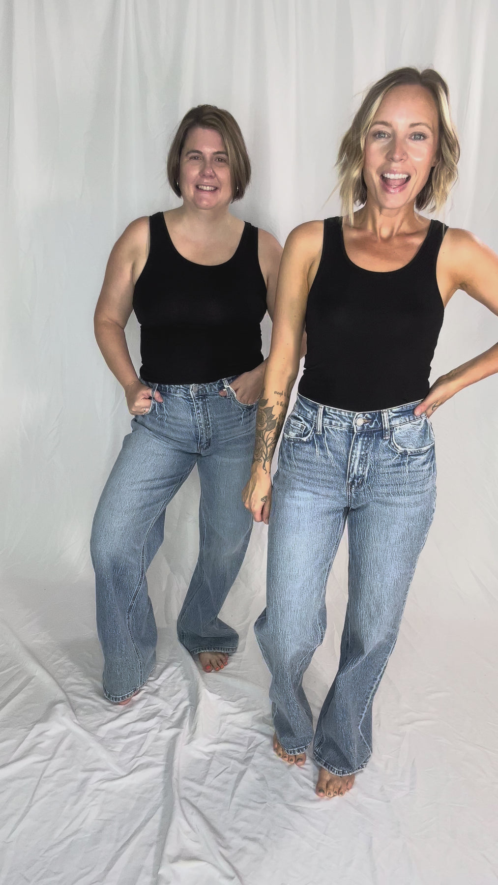 Retro vibes with a modern twist—these vintage wash wide-leg jeans with subtle distressing are all about laid-back, effortless style.