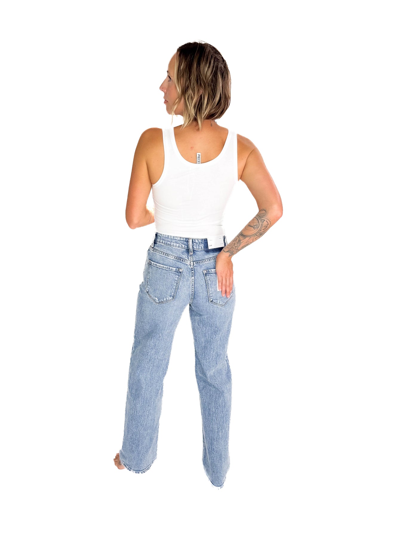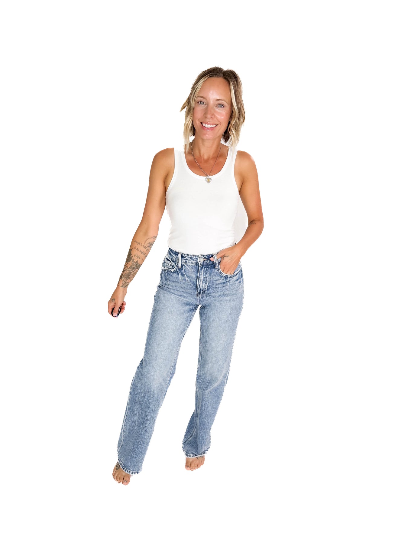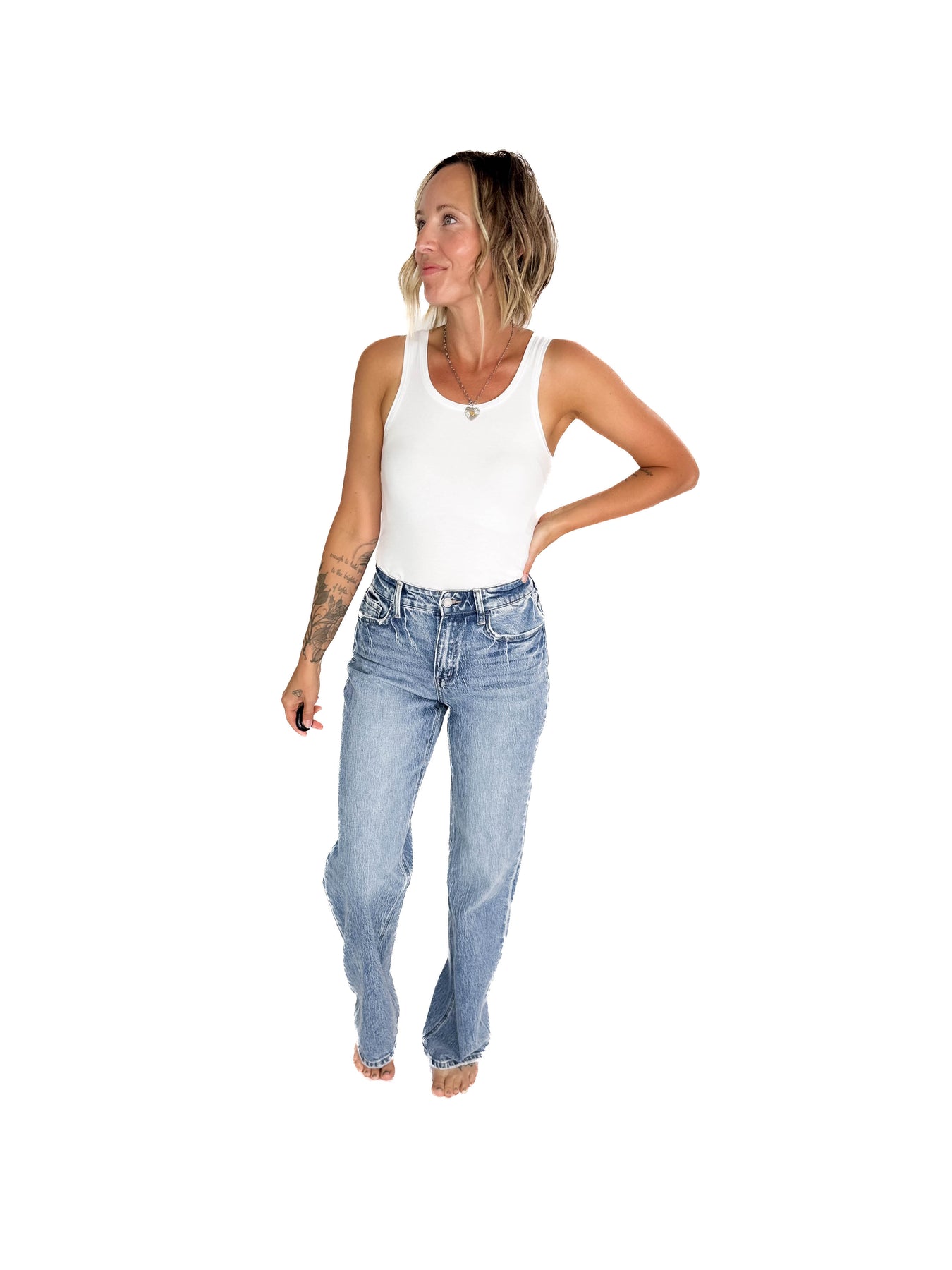 Retro vibes with a modern twist—these vintage wash wide-leg jeans with subtle distressing are all about laid-back, effortless style.