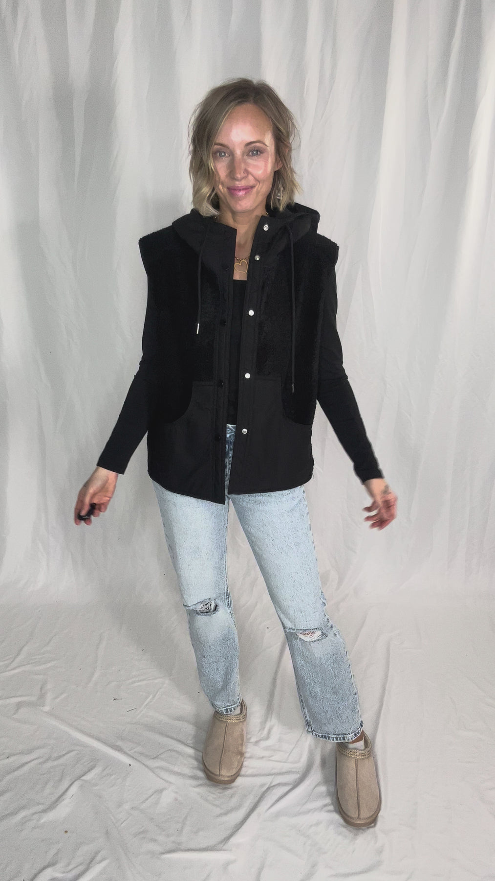 Additional: Sherpa Vest, Nylon Contrast, Front Snap Closures, Hood with Drawstring, Soft Lining, Functional Pockets