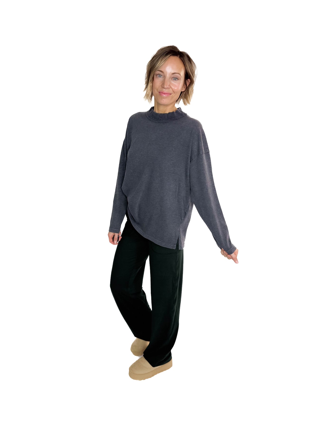 Additional: Mineral Washed Finish, Mock Neck, Small Side Slits, Inverted Seam Details, Relaxed Fit