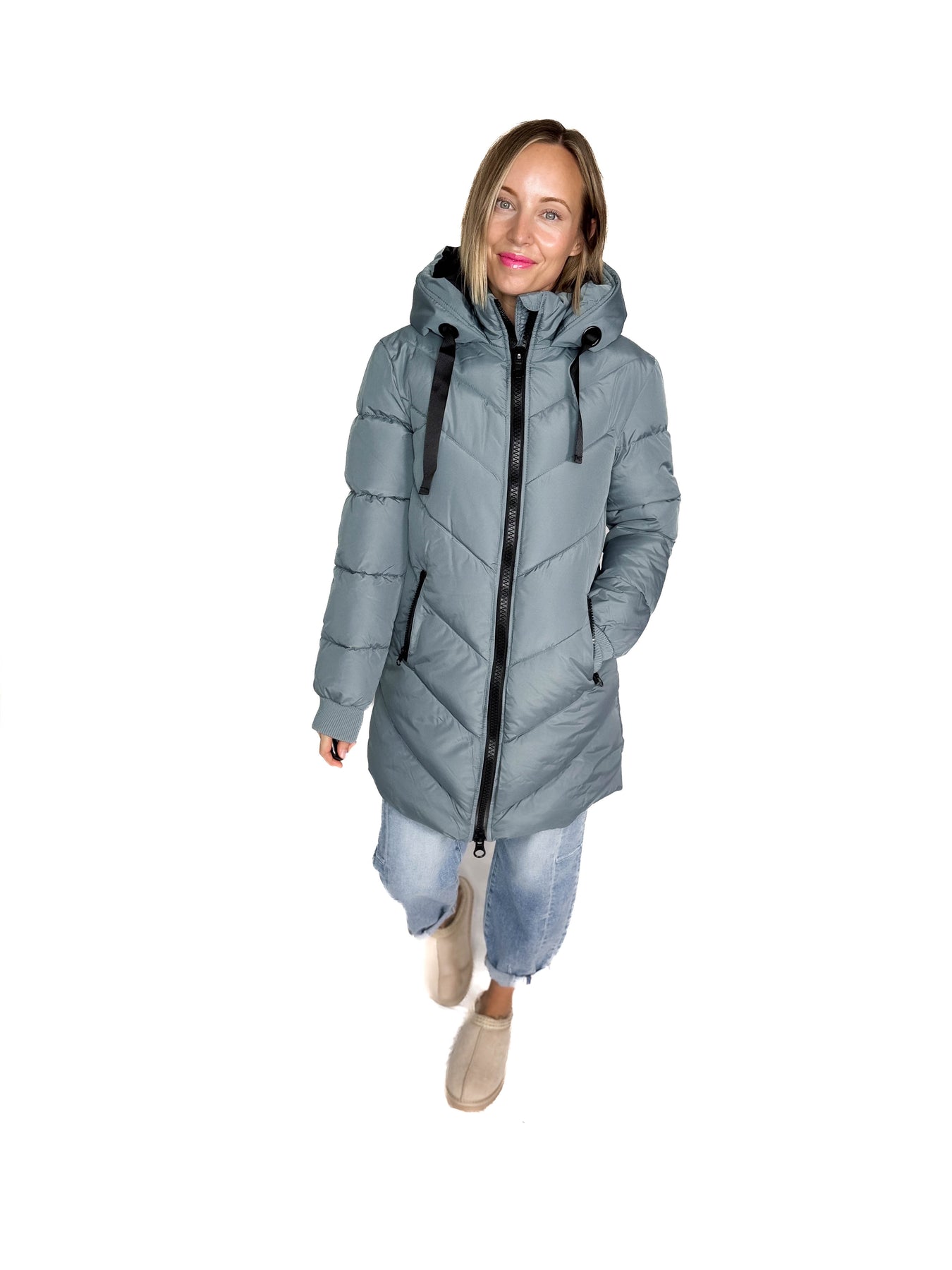 Additional: Puffer Coat, Full Chunky Zipper, Ribbed Cuffs, Lined Interior, Mock Neck, Warm, Zipper Pockets, Drawstring Hood