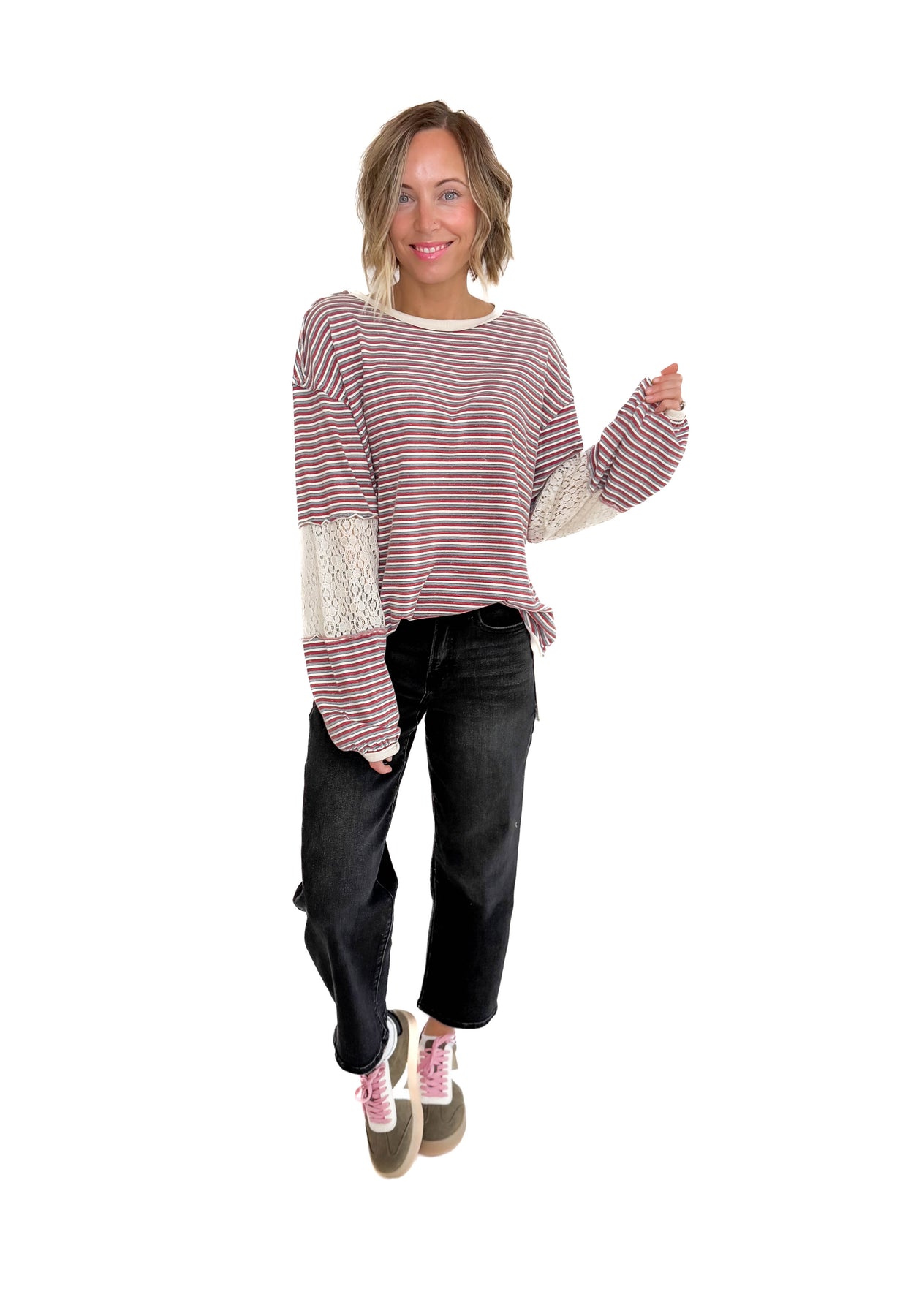 Additional: Side Slits, Striped Pattern, Lace Sleeve Details, Crew Neck