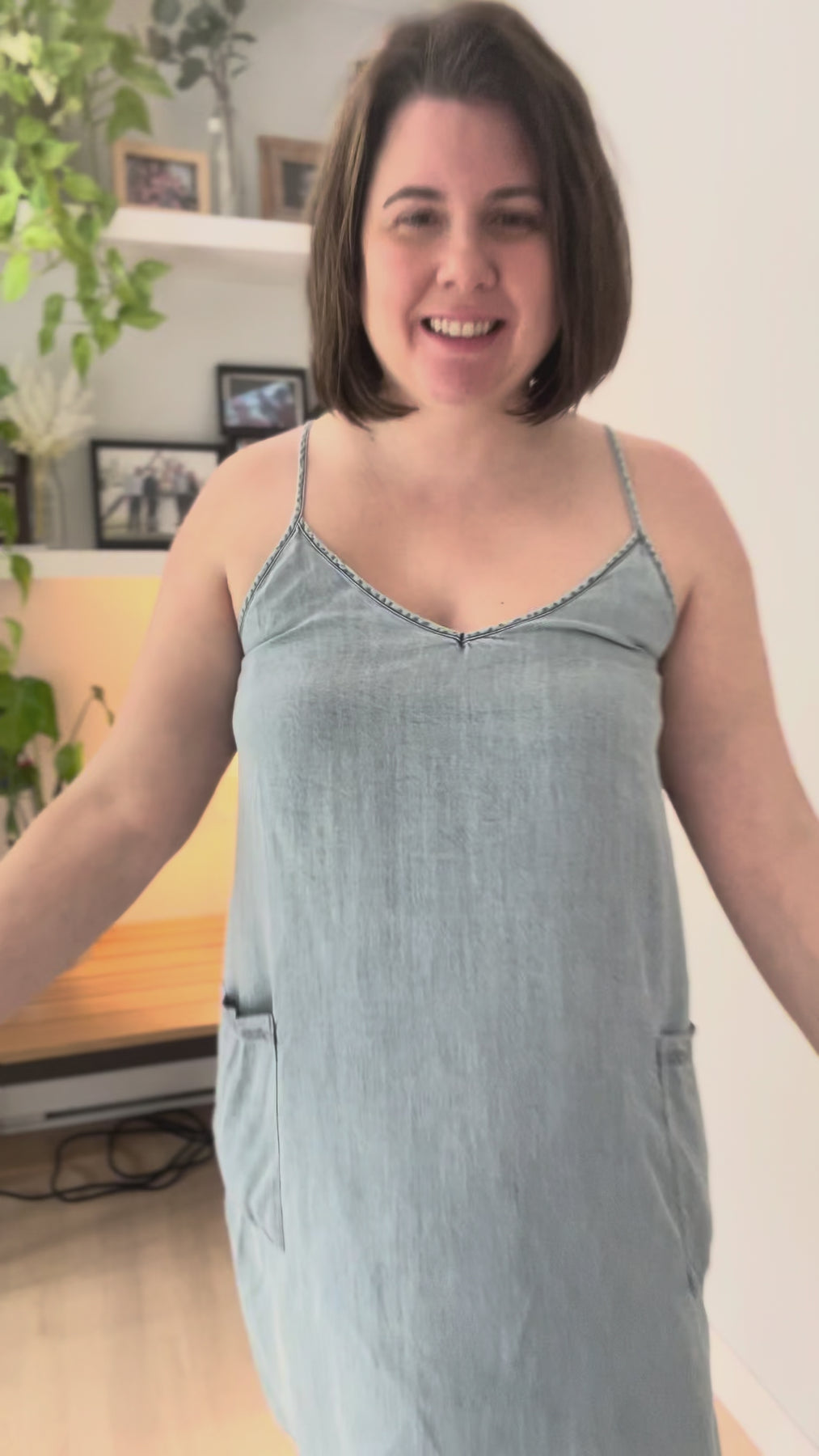 Additional: Mini Dress, Adjustable Spaghetti Straps, Denim Look Wash, Front Patch Pockets