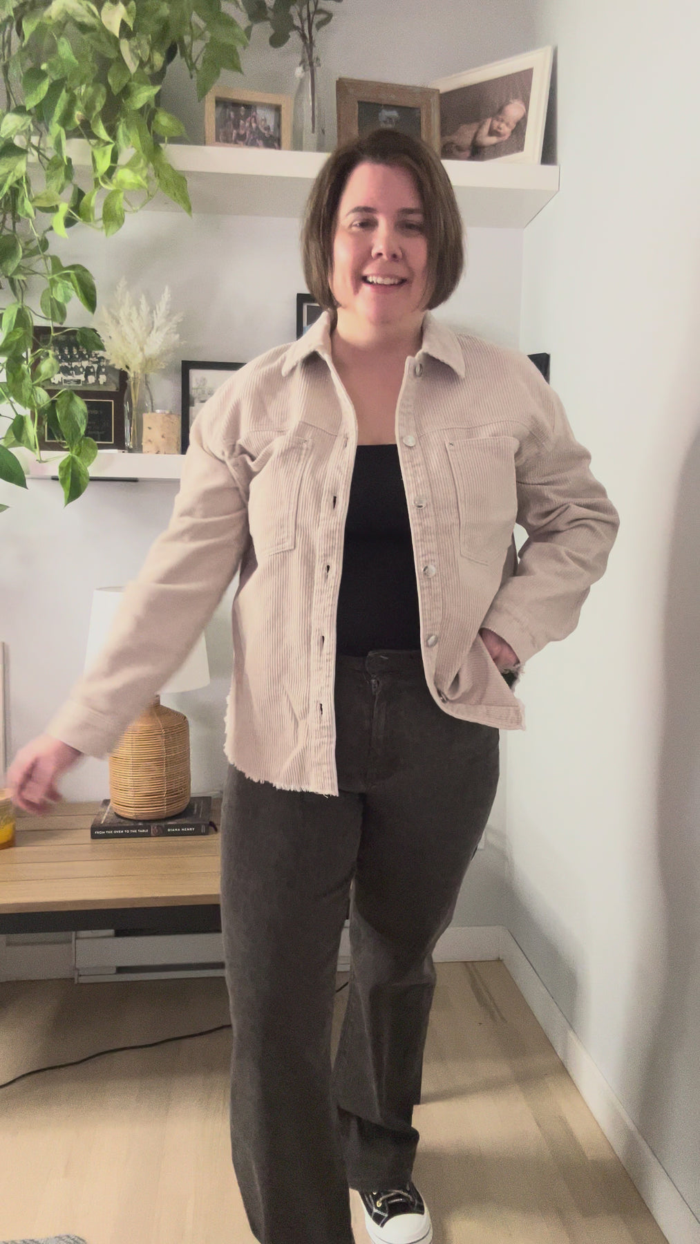 Additional: Corduroy Shacket, Full Button Closure, Button Cuffs, Frayed Raw Hem, Rounded Hemline, Chest Pockets, Collar