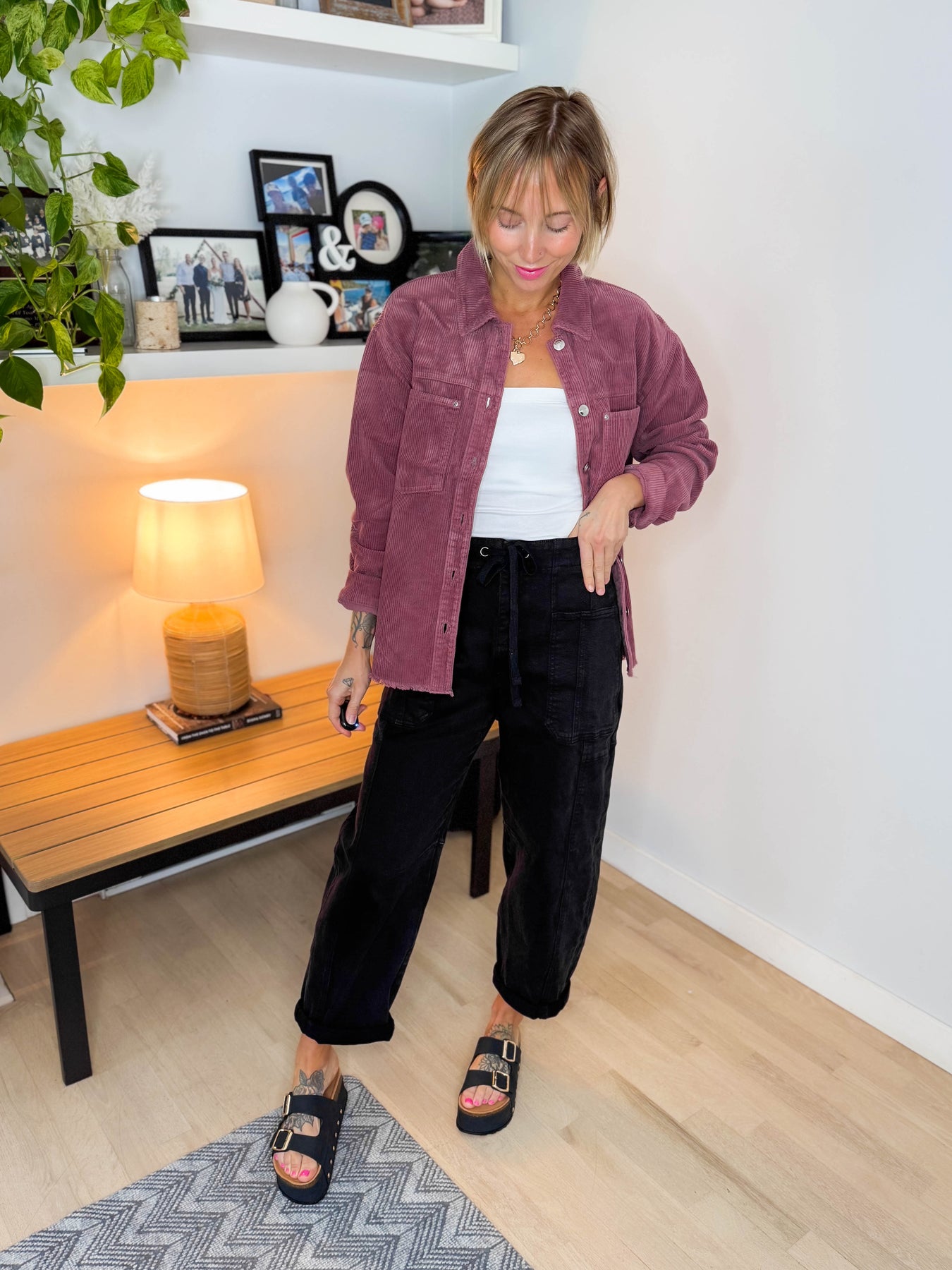Additional: Corduroy Shacket, Full Button Closure, Button Cuffs, Frayed Raw Hem, Rounded Hemline, Chest Pockets, Collar