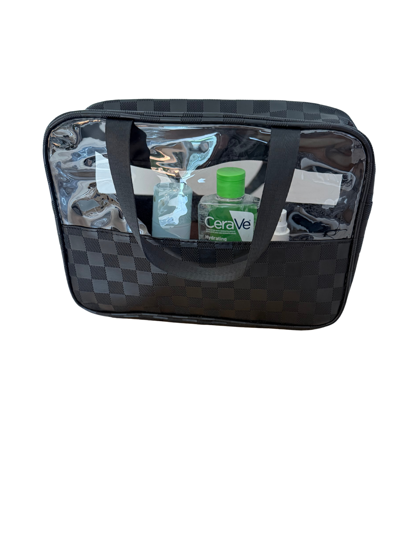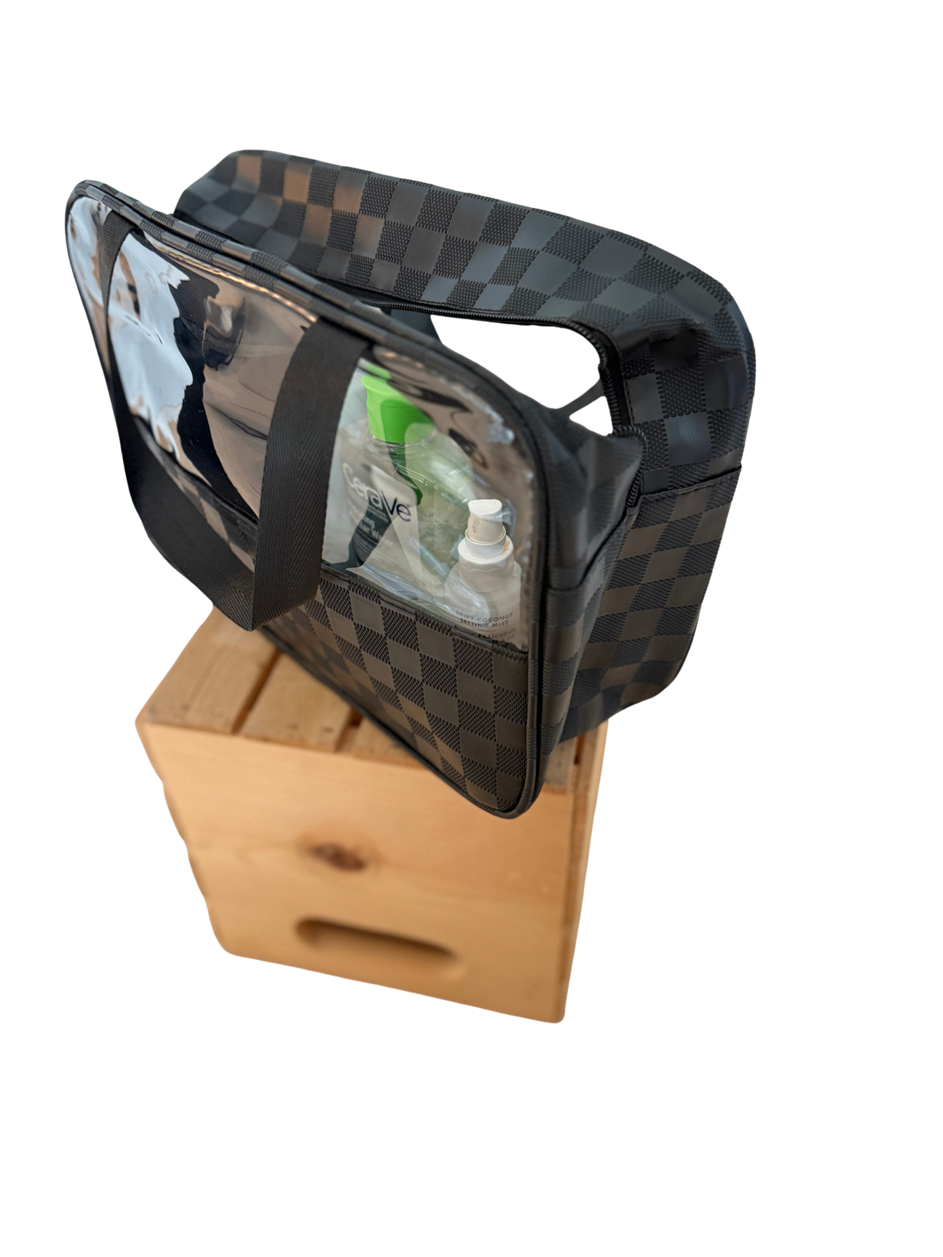 Additional: Zipper closure, transparent design, checker contrast, handles, spacious interior
