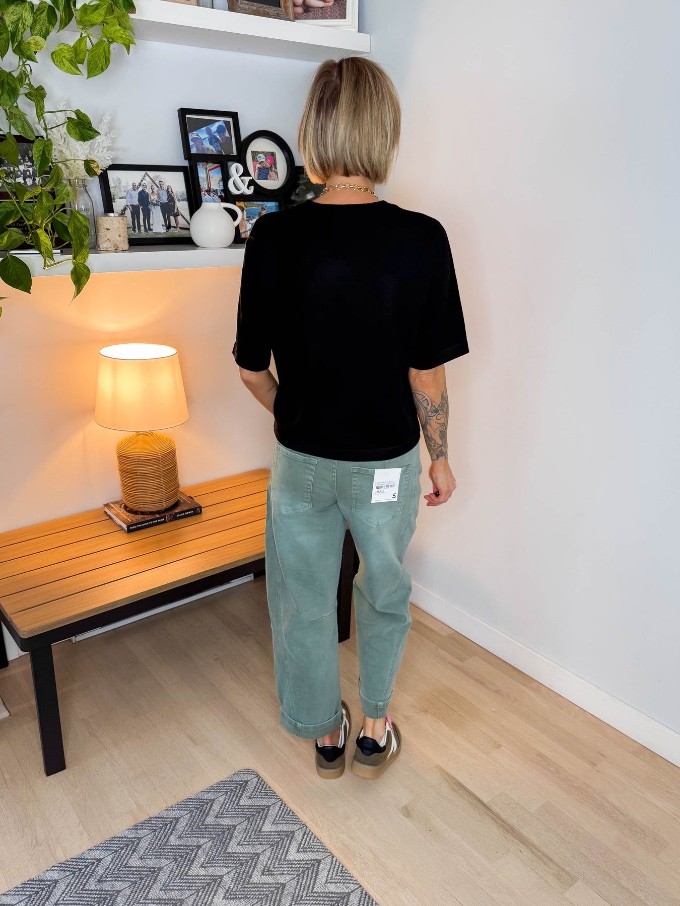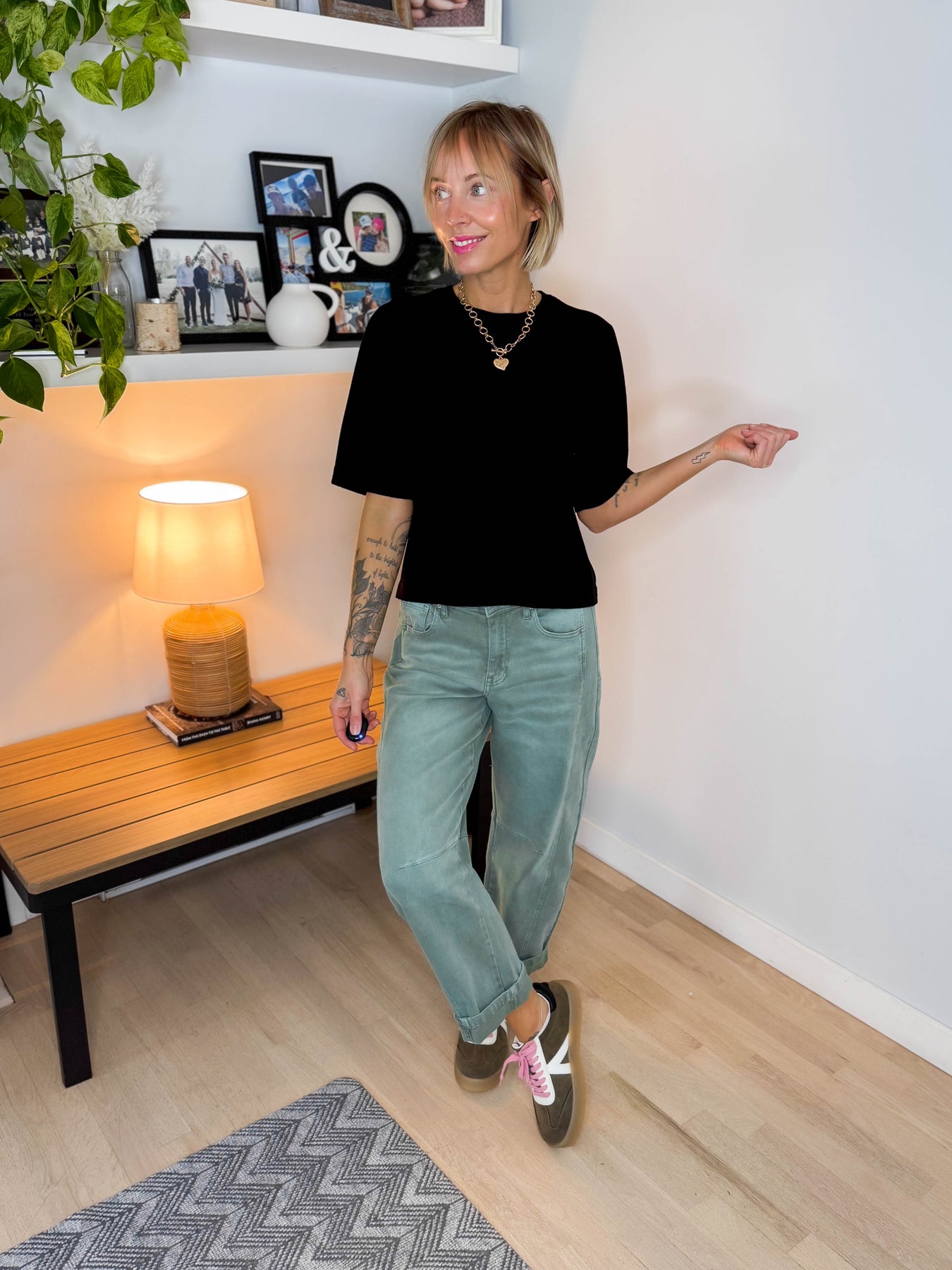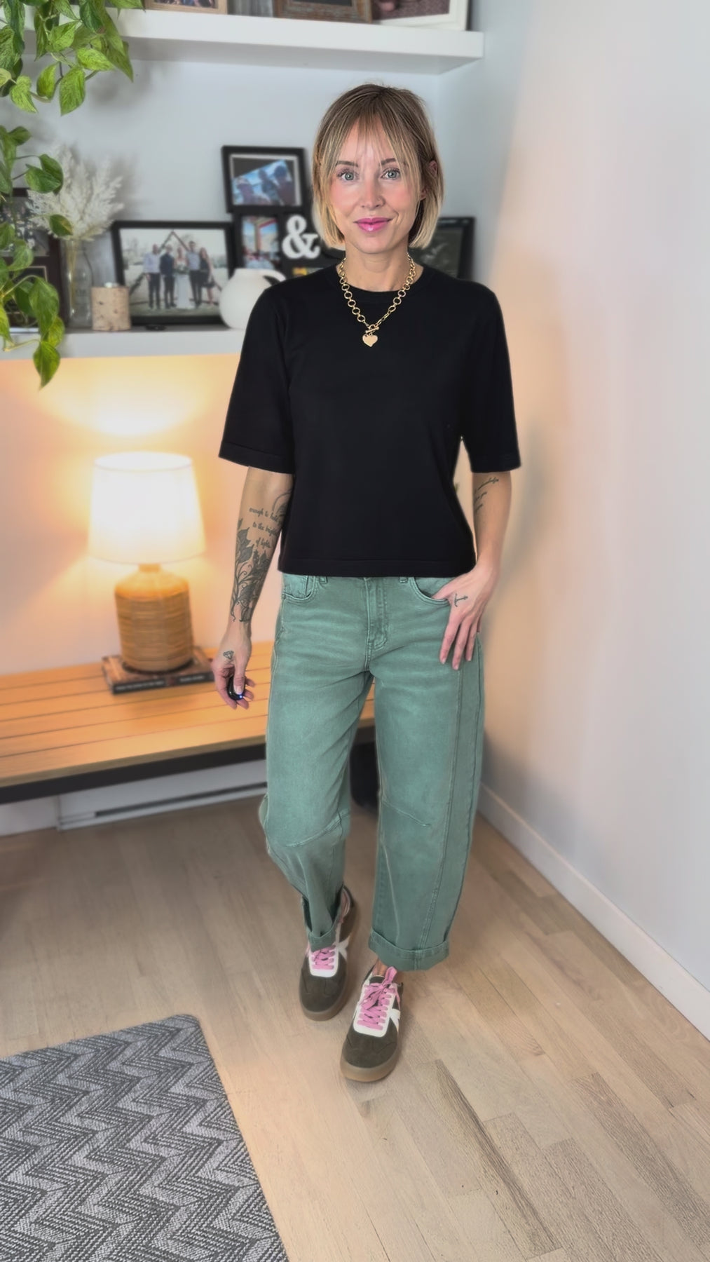 Soft, sleek, and effortlessly elevated — this fitted sweater tee is the perfect polished basic for everyday wear.