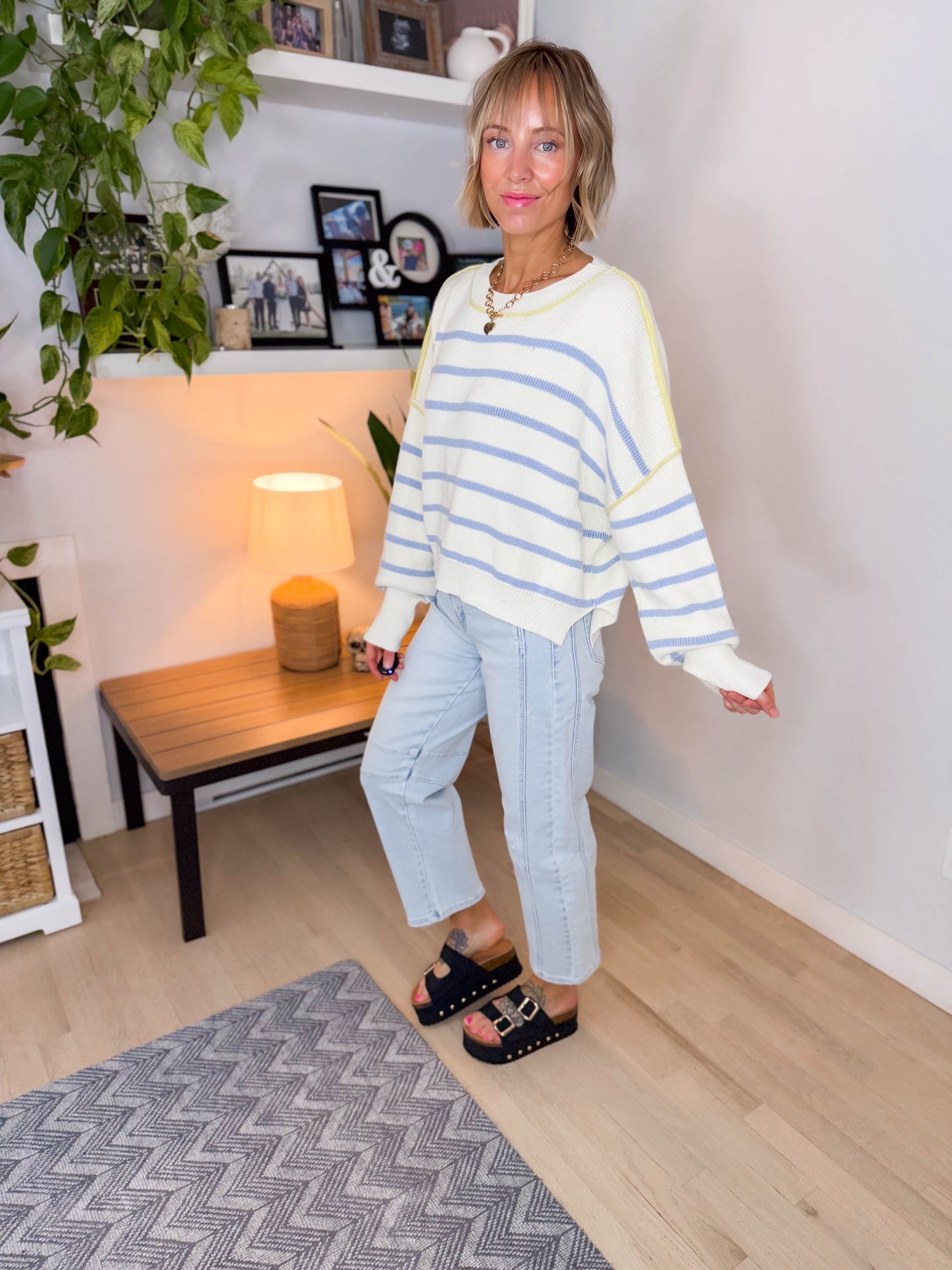 Additional: Soft knit long sleeve crew neck sweater, small side slits, contrast seam detailing, striped pattern