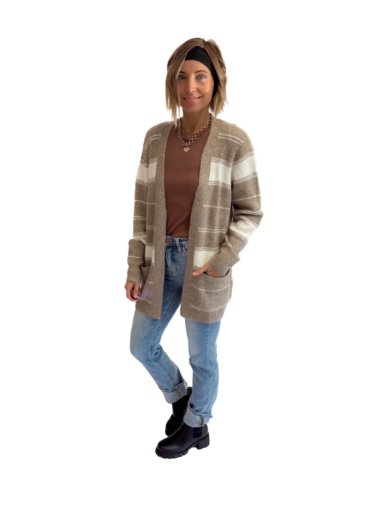Anvil Striped Pocket Cardigan- CREAM/MOCHA