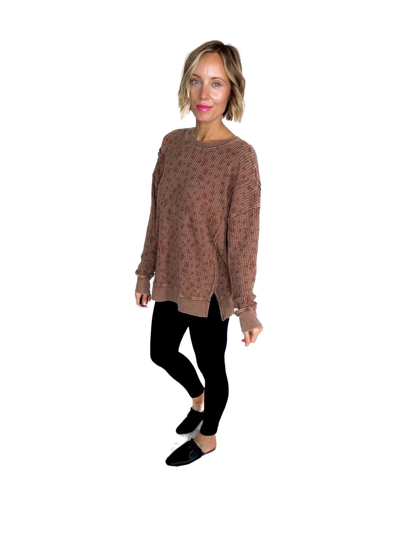 Additional: Floral print, waffle texture, long sleeves, side slits, ribbed cuffs and hem, inverted seam details