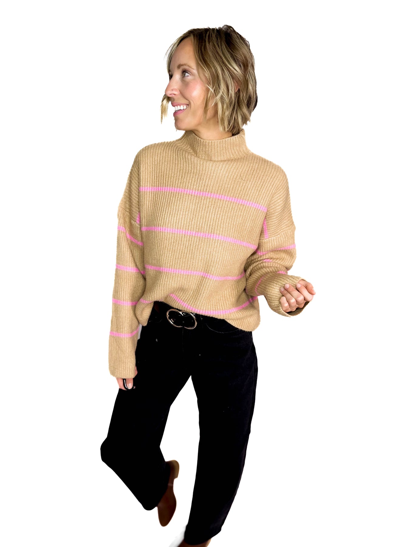 Classic comfort with a modern twist—this soft knit striped sweater with a mock neck is cozy, chic, and perfect for layering.