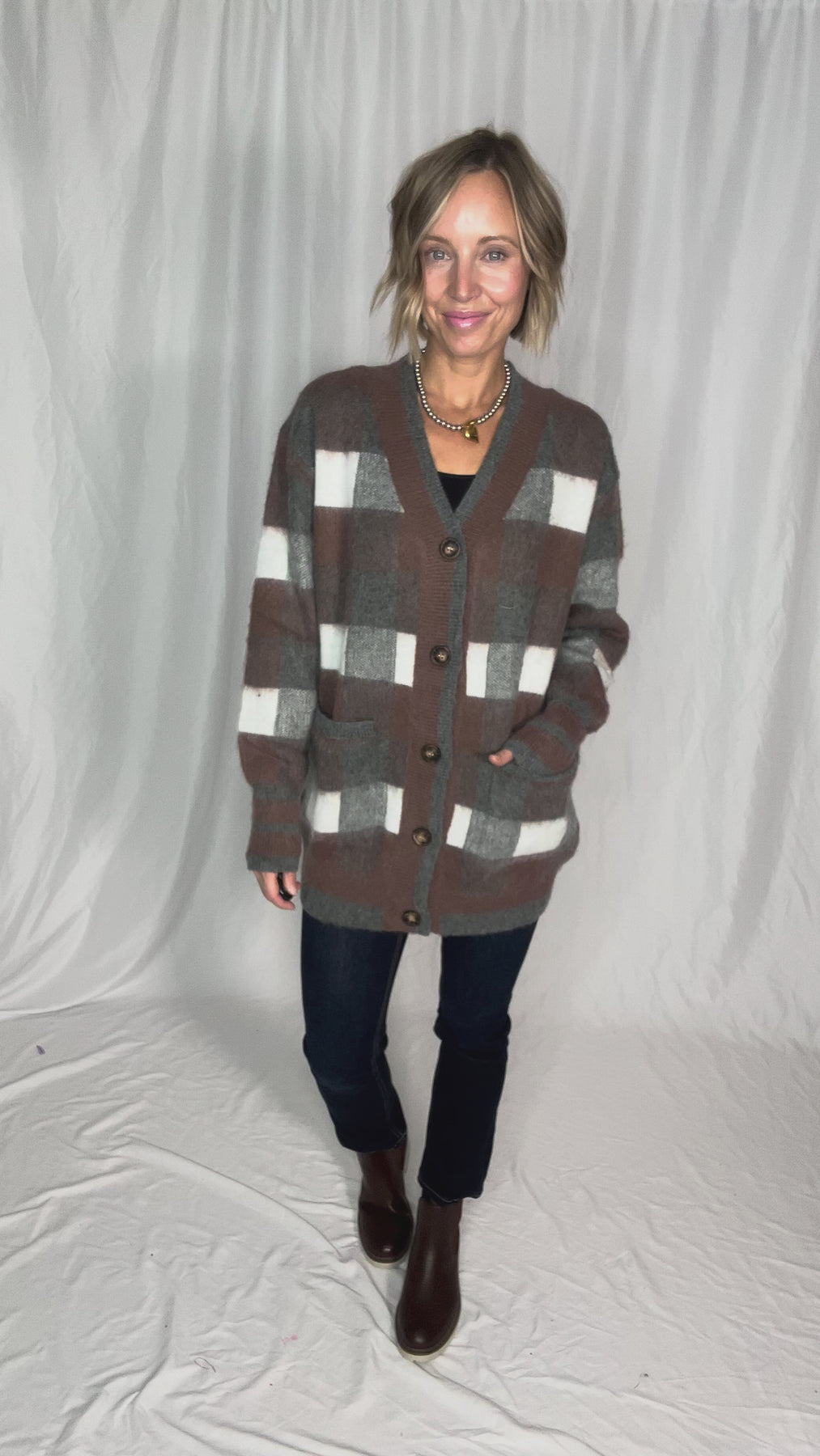 Timeless warmth—this tartan brushed cardigan brings classic patterning and cozy layers together for effortless fall style.