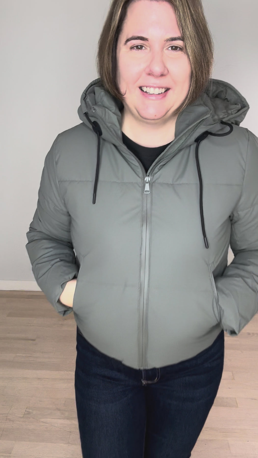- Drawstring hood and zipper pockets for functional style