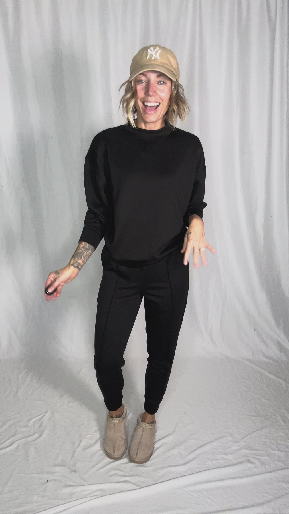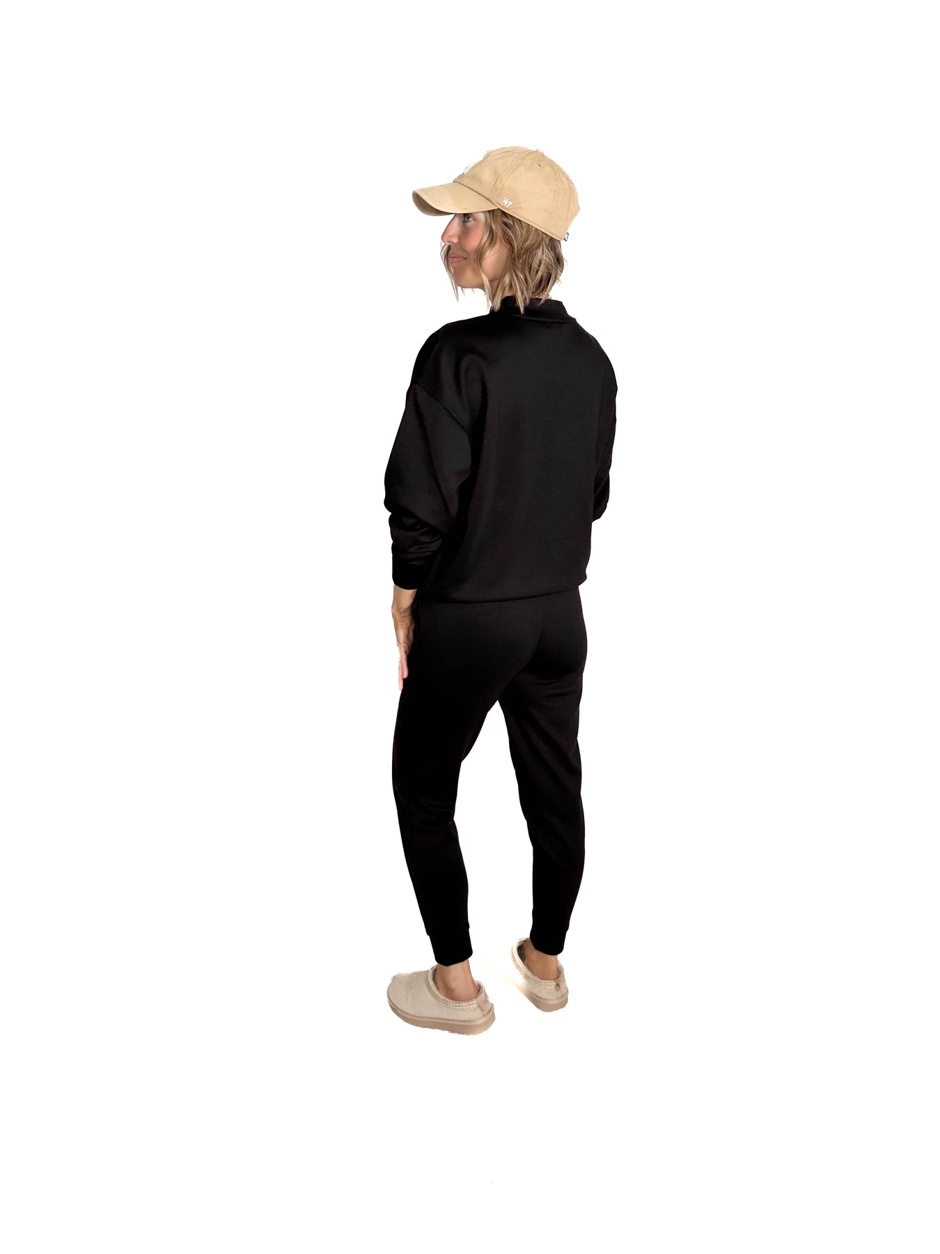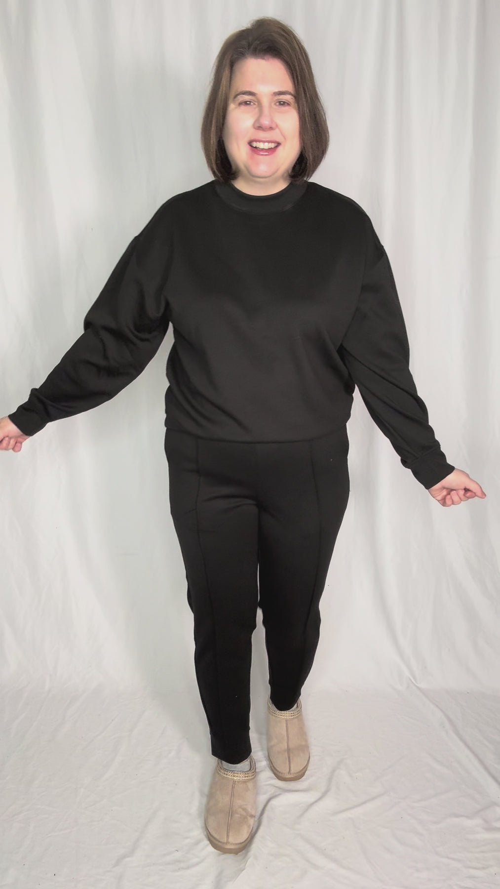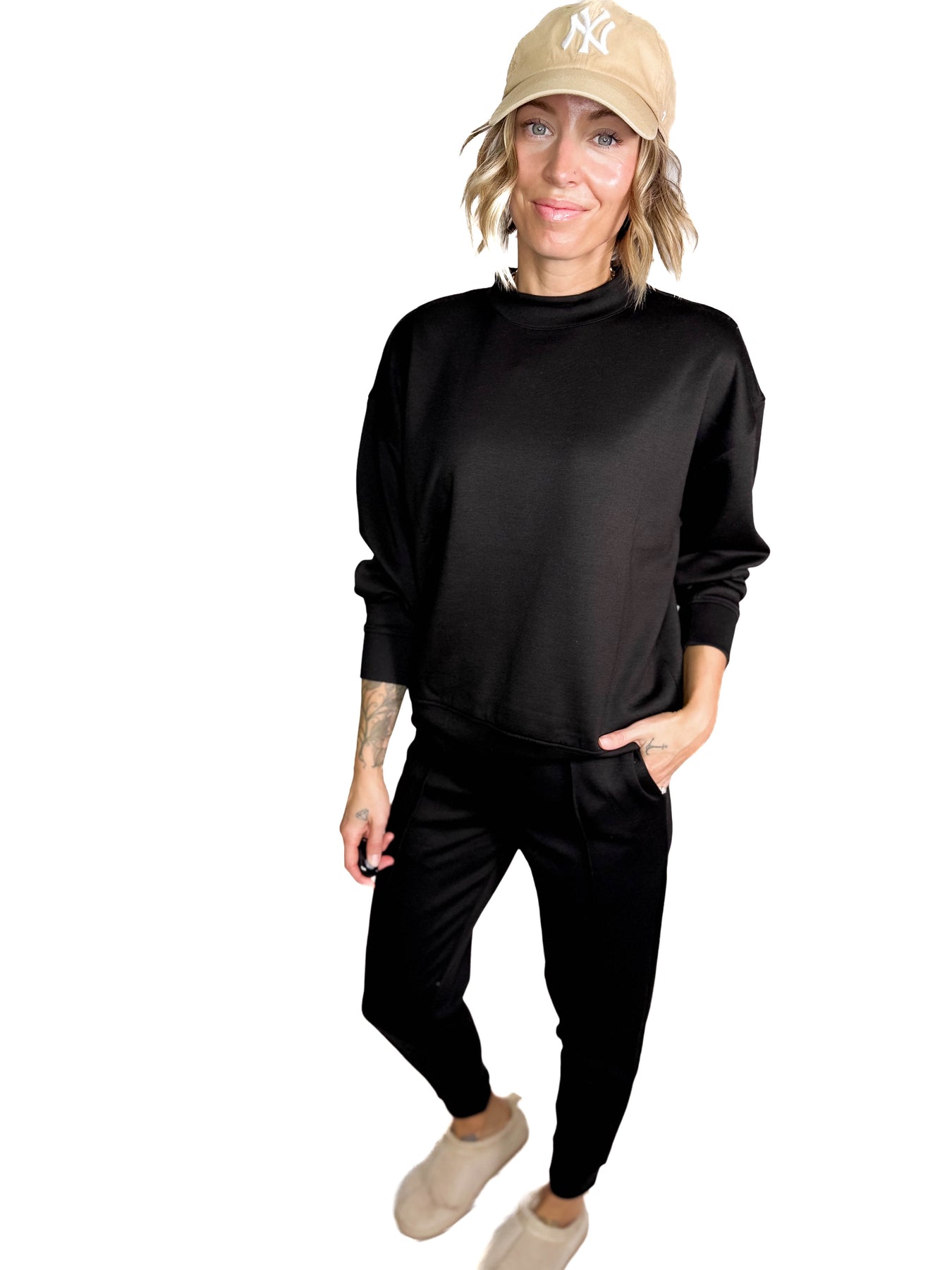 Additional: Soft Scuba Fabric, Mock Neck Pullover, Elastic Waist Jogger, Front Pleat Detail, Functional Pockets
