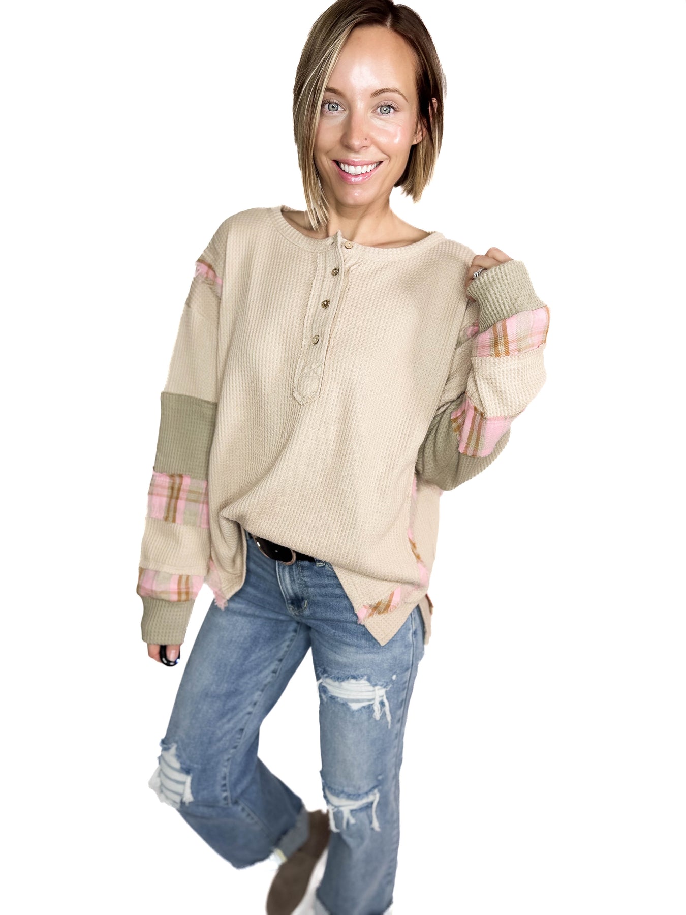 Additional: Waffle Long Sleeve Top, Plaid Contrast, Frayed Inverted Seam Details, Elastic Cuffs