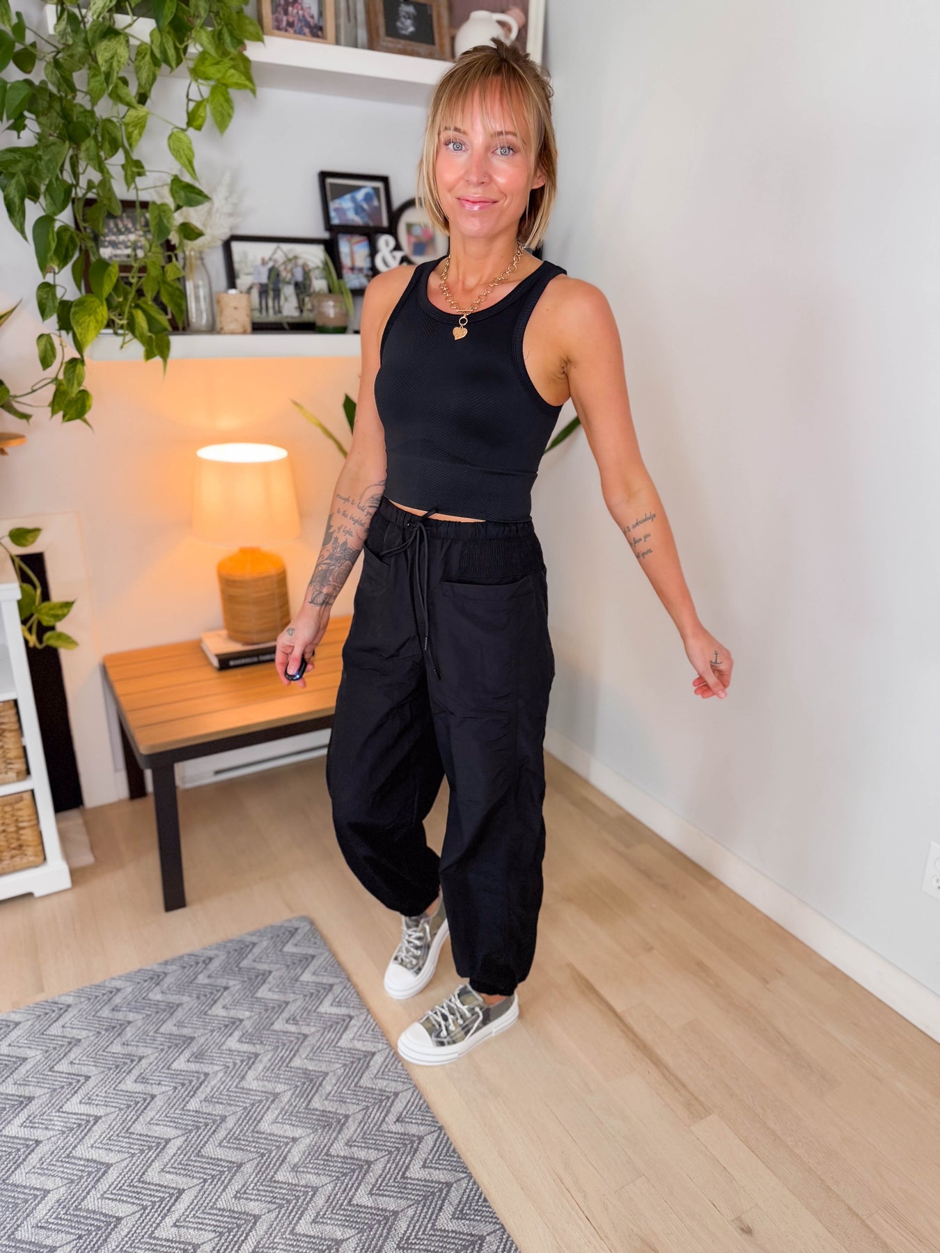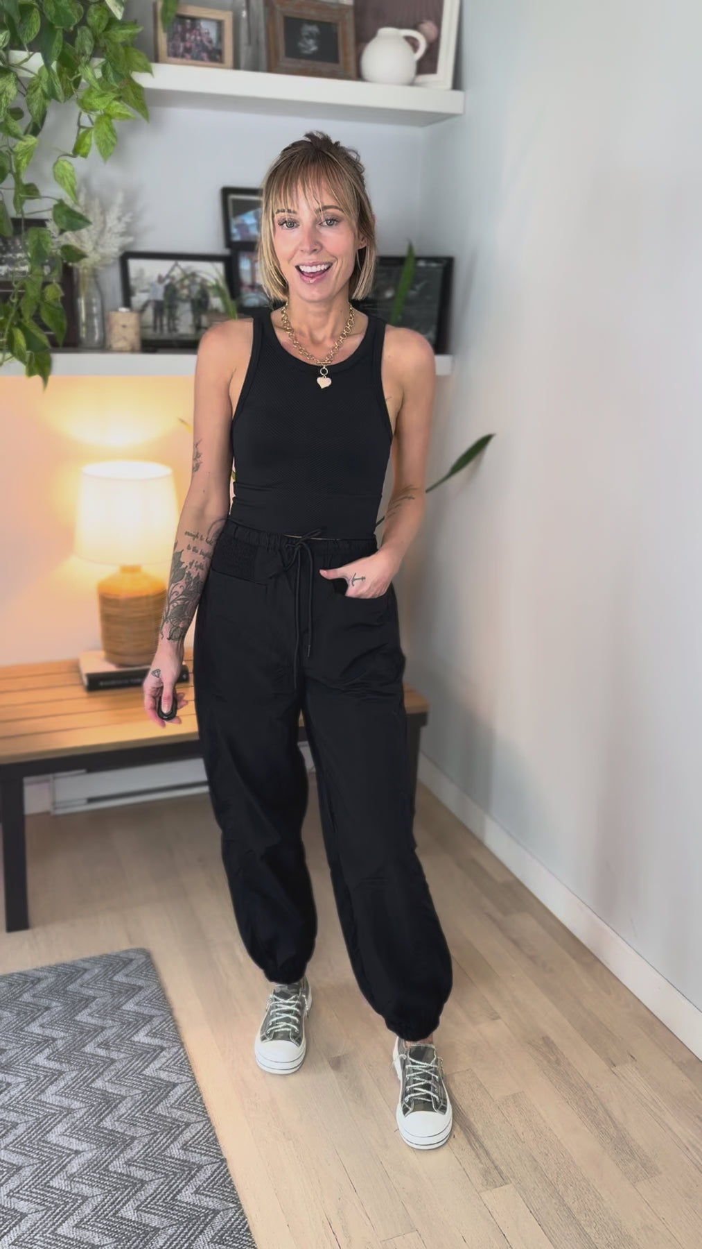 Additional: Drawstring elastic waist joggers, elastic cuffs, pockets, stretch fabric