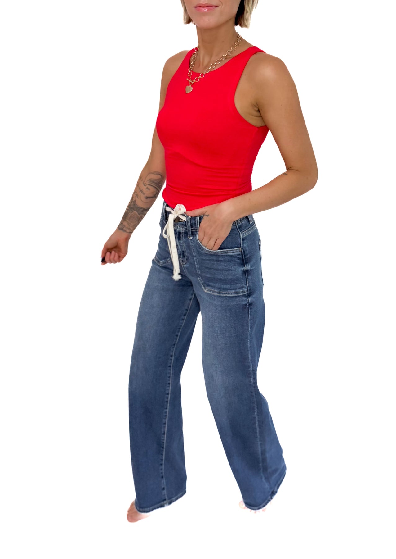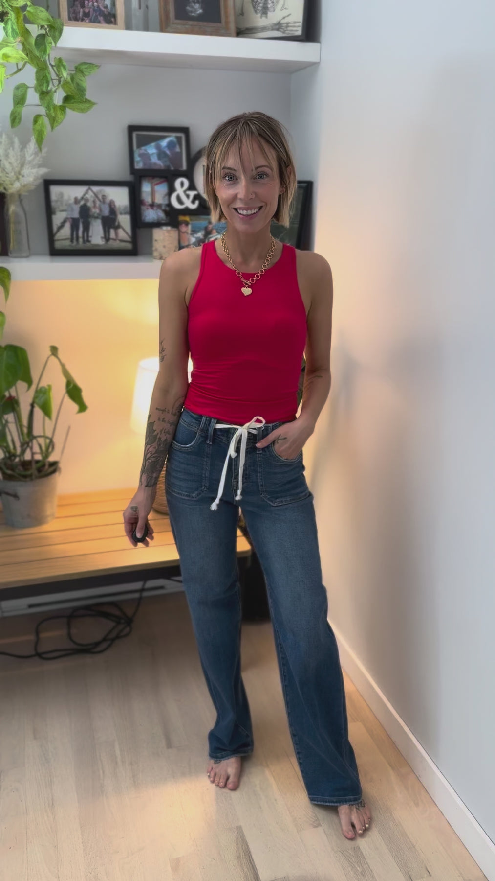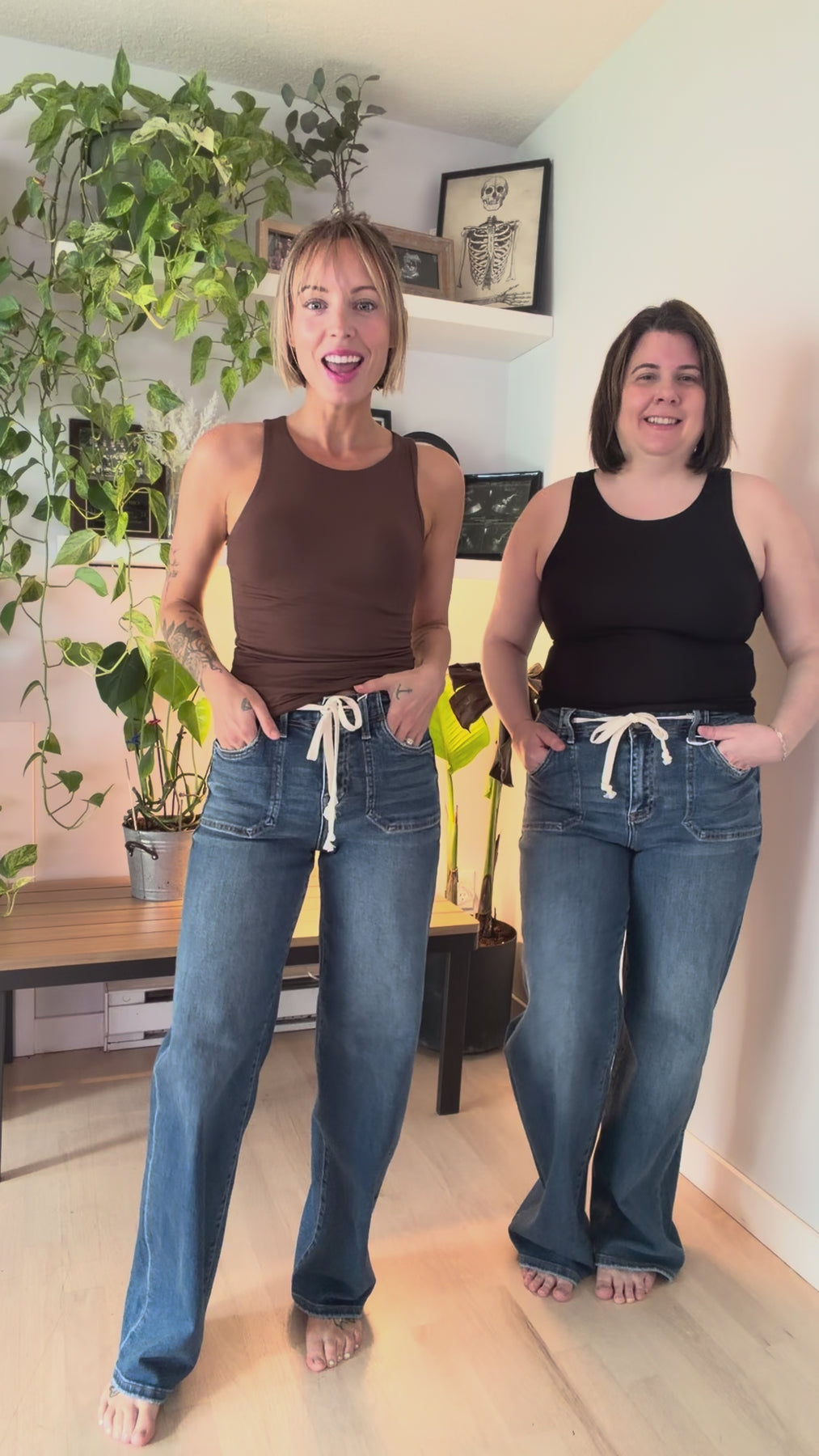 Additional: Drawstring Tie Waist, Relaxed Straight/Barrel Leg, No Distressing