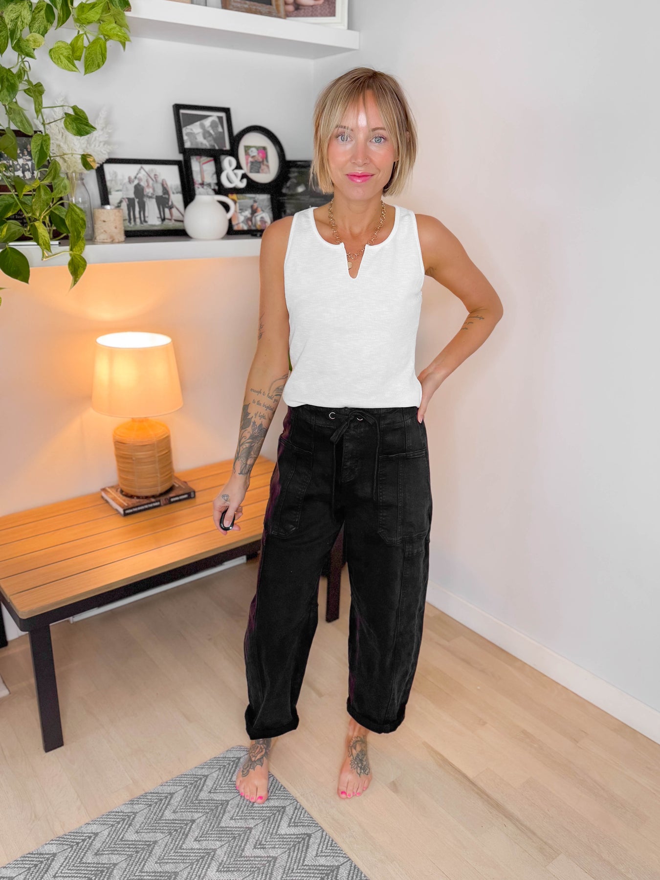 Barrel-style denim with a relaxed fit, elastic drawstring waist, and adjustable cuffed or uncuffed length.