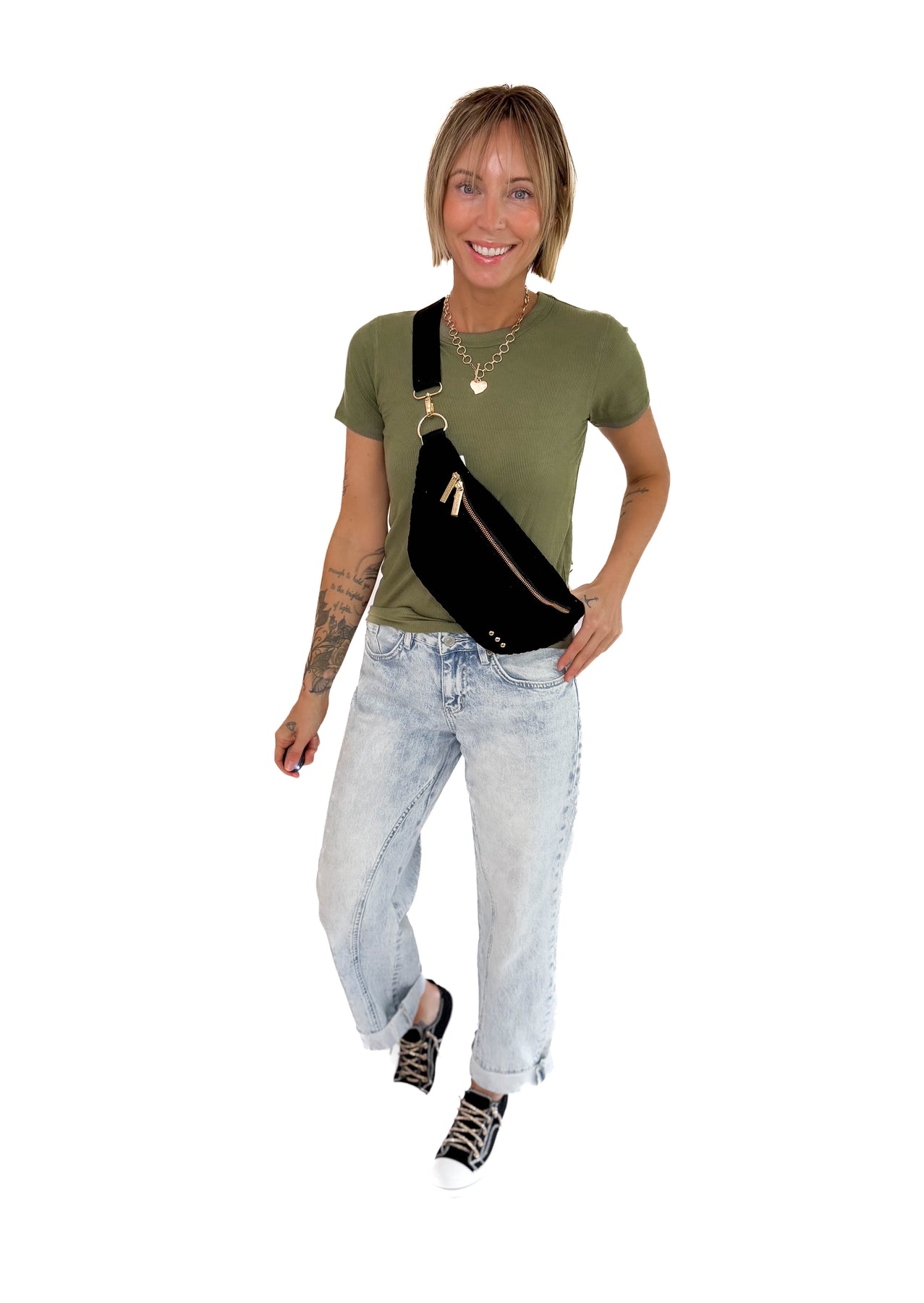 Additional: Woven suede design, gold tooling, zipper closures, adjustable strap